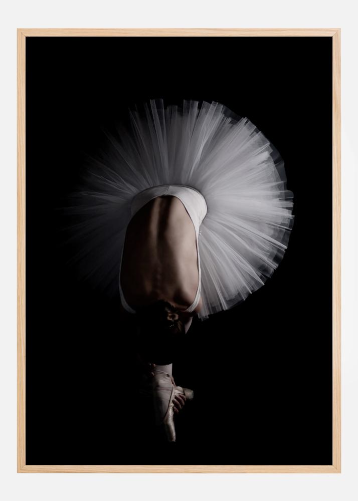 Et dramatisk luftbilde av en ballettdanser som bøyer seg fremover for å nå skoene sine. Den mørke, svarte bakgrunnen gjør at den hvite tutuen hennes stikker ut i en lys sirkel rundt henne. De tydelige linjene på ryggen hennes fører blikket mot de elegante spisse føttene. Eleganse og drama eksponeres i flott kombinasjon i dette enkle bildet.