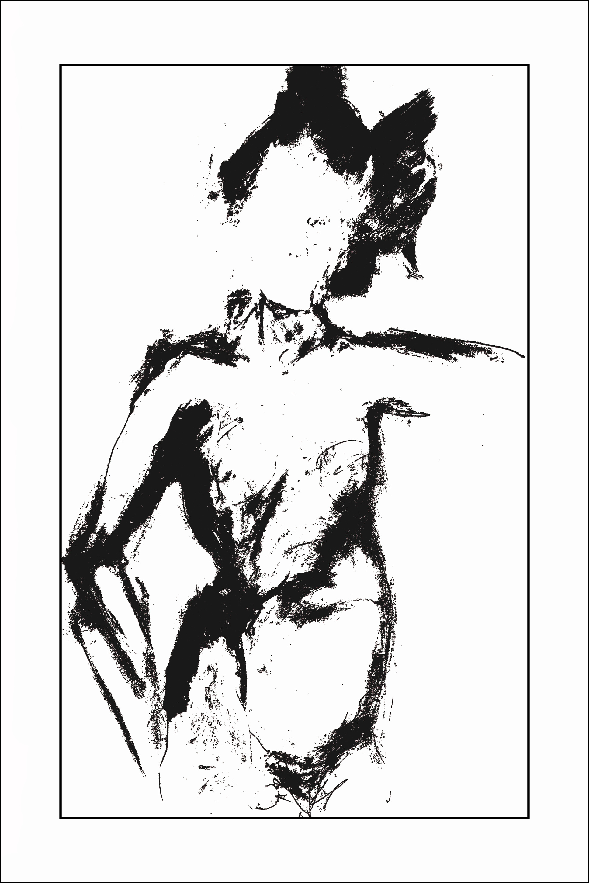 En svart-hvitt-plakat med en figurtegningsmodell. De tykke dristige svarte penselstrøkene har skapt denne kvinnen i en nesten chiaroscuro-stil. Betrakt dette en stund, så vil du nesten vente på at hun skal bevege seg.