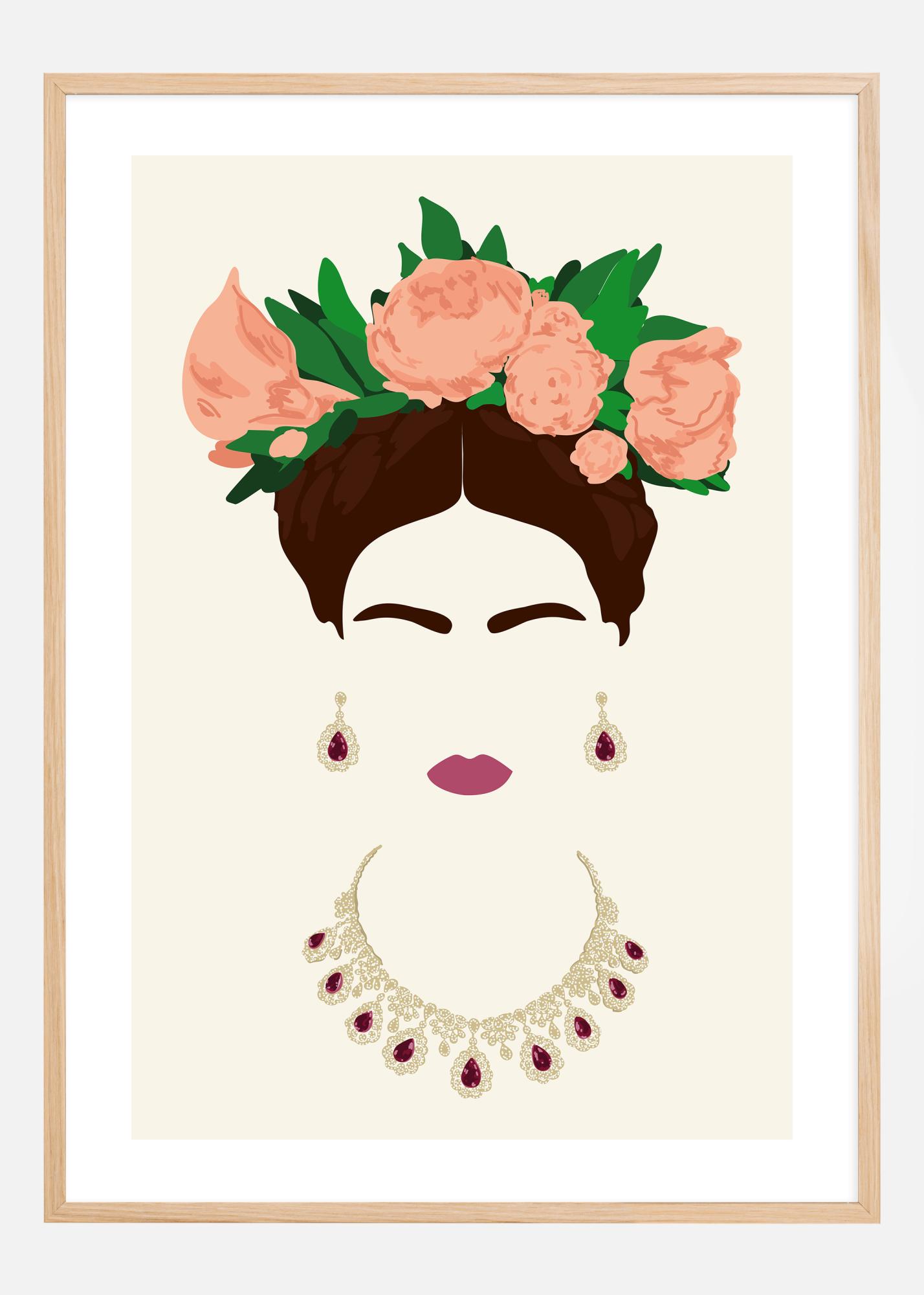 Denne distinkte plakaten avbilder en stilisert kvinnefigur prydet med en rik flora og elegante smykker. Motivet fremstiller en harmonisk sammensetning av mørkebrunt hår, kremfarget hud og en strålende krans av korallrosa blomster komplettert med mørkegrønne blader. Hennes ansiktstrekk er redusert til minimalistiske former, som gir en moderne følelse.