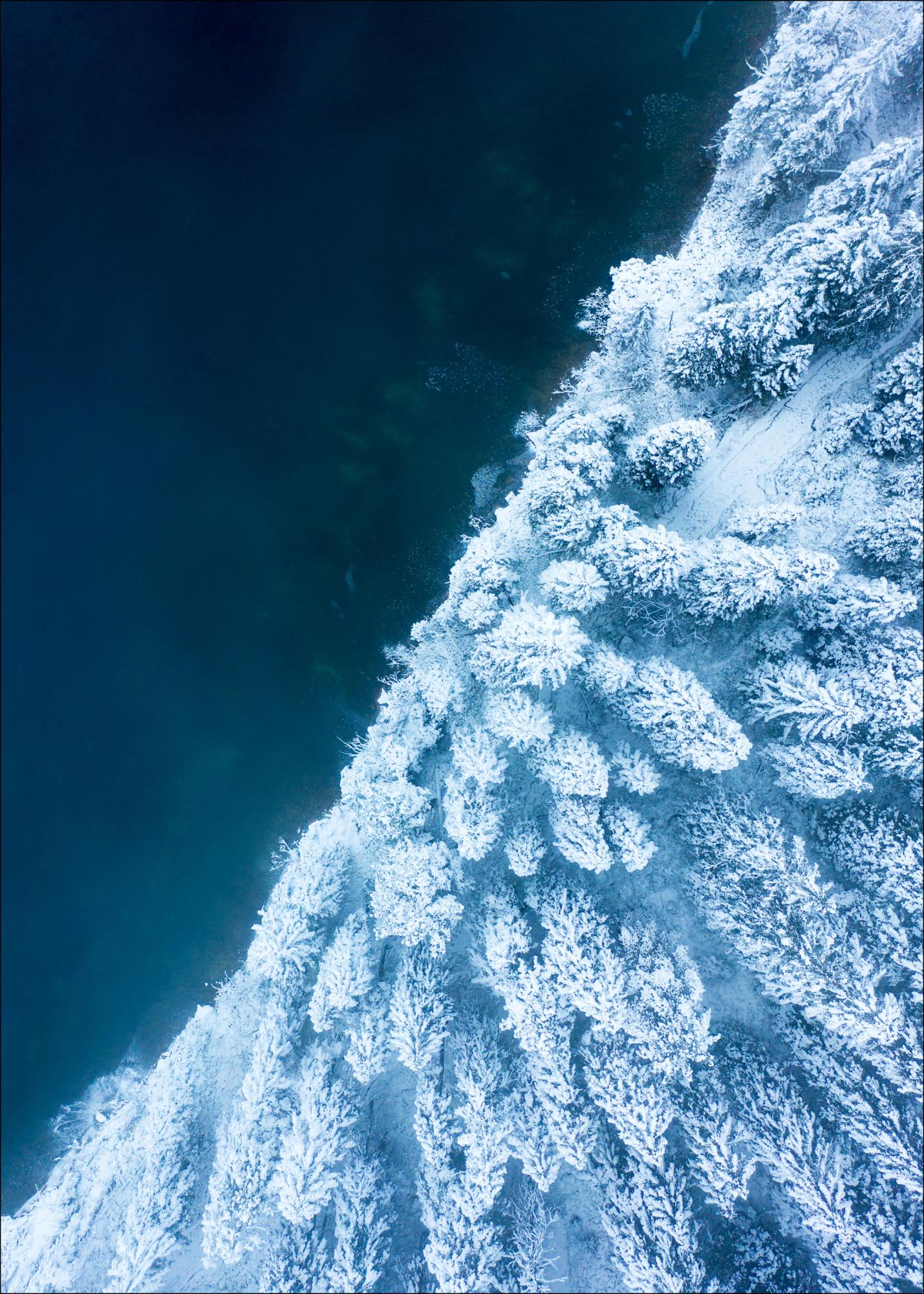 En spennende fotografisk poster i fugleperspektiv hvor snødekt skog møter et blåfrossent hav i en skarp diagonal. En vakker naturposter i kalde toner, perfekt å ha som en del av et større collage.