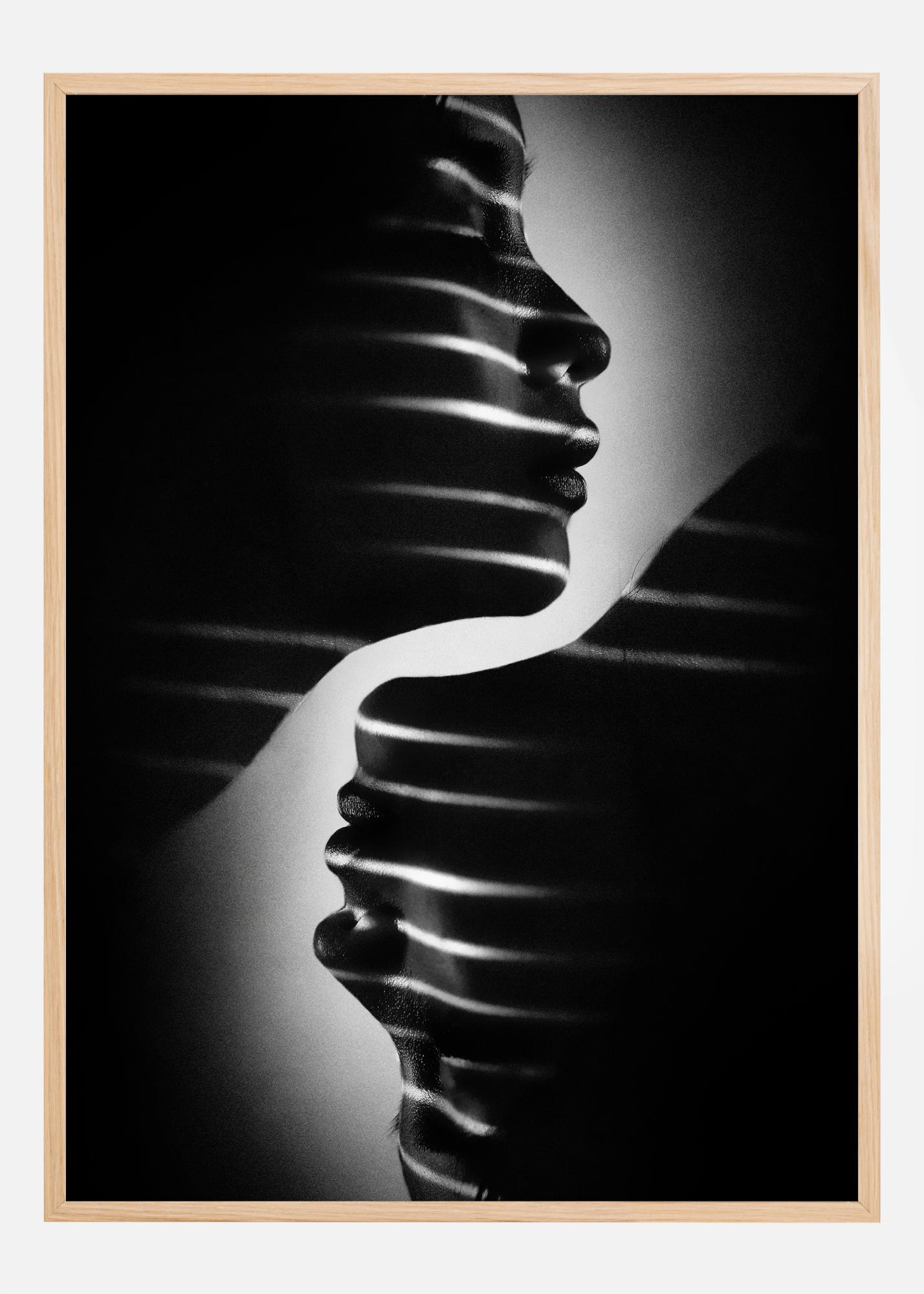 En dramatisk dobbeltportrett-plakat med to ansikter i profil. Stenger av lys skinner dramatisk over disse mørke ansiktene med en stråle av omsluttende lys bak å skape en lysring. Heng dette på en hvit vegg for å øke dramaet i denne svart-hvitt-plakaten.