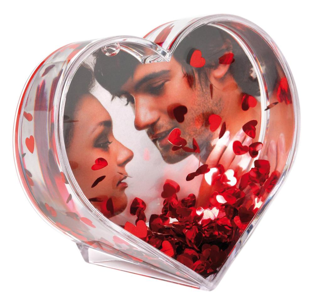 Denne hjerteformede fotorammen gir bildene dine en veldig romantisk innramming. Rammen er laget av slitesterk akrylplast og fylt med røde metallhjerter, noe som skaper en funksjon som ligner på en "snøkule". Fotorammen har plass til 1 bilde i størrelsen 9,1x6,5 cm.