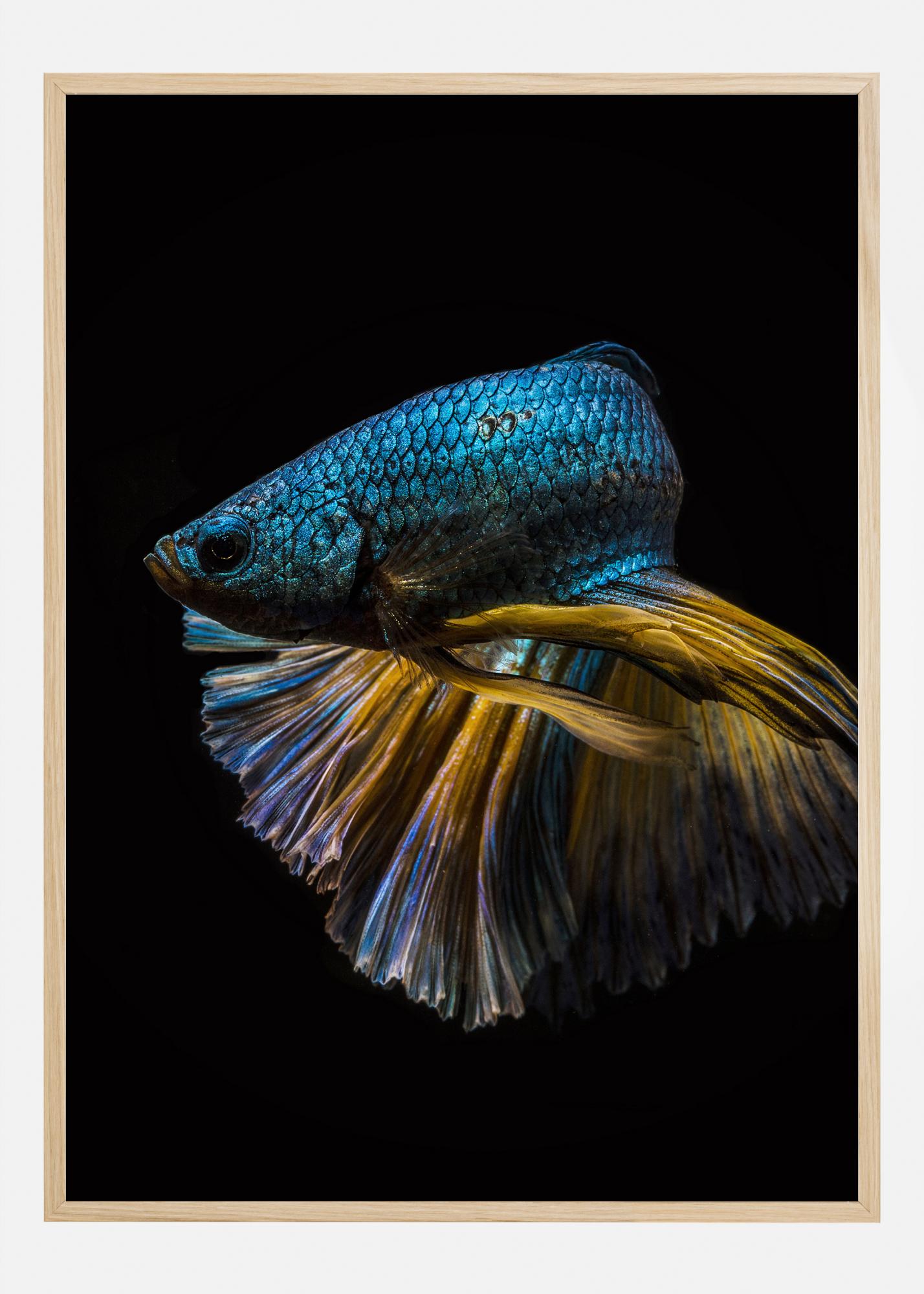 En fantastisk naturplakat av en flerfarget siamesisk kampfisk på en svart bakgrunn. Snudd mot venstre side, viser den flerfargede halen dens en rekke farger. Heng denne vakre plakaten på en farget vegg for å skape en fargekontrast.