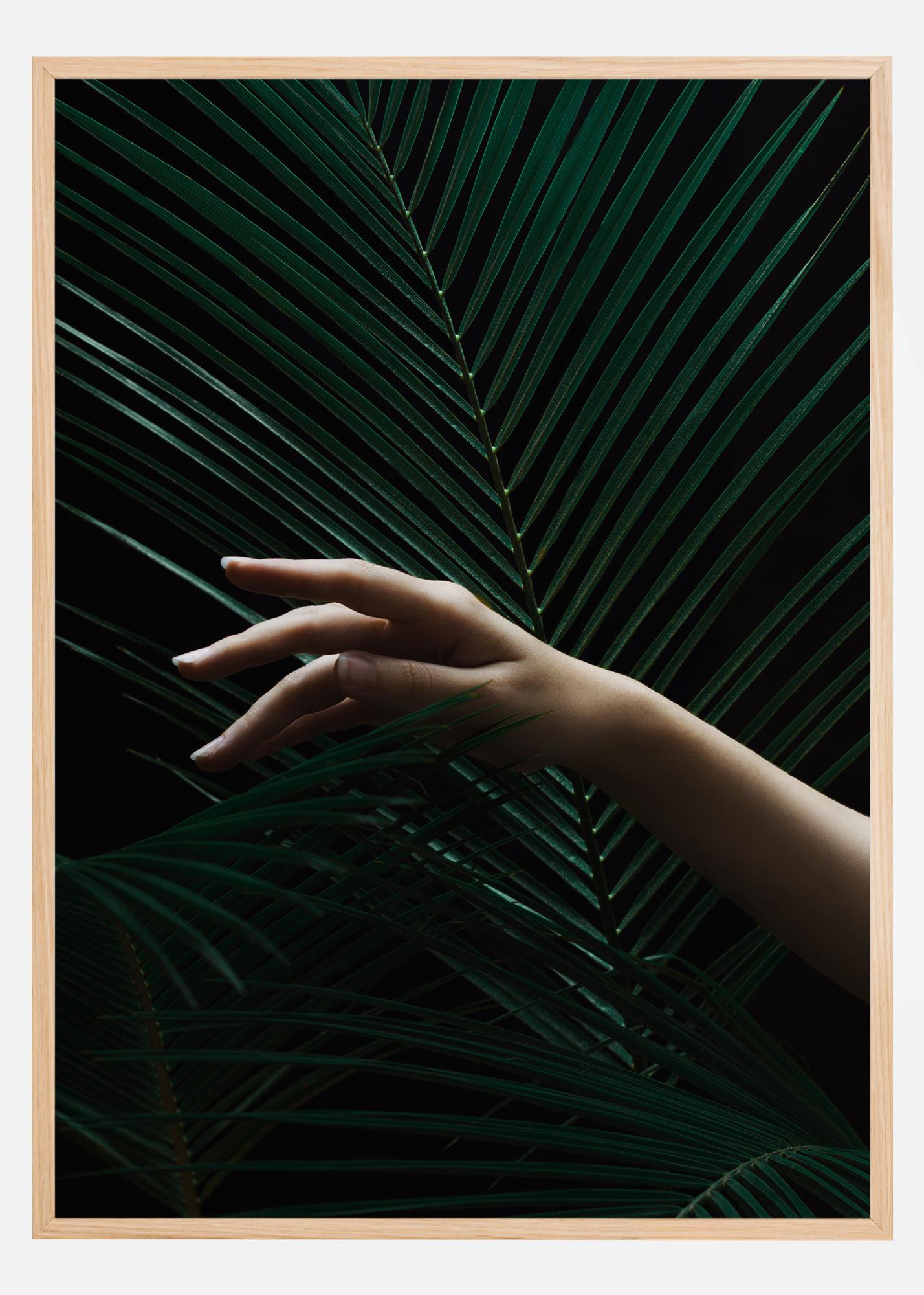 Et botanisk fotografi av grønne palmelignende grener foran en svart bakgrunn. En utstrakt hånd bidrar med et livlig og kontrasterende element. En dyp posters som passer perfekt på en større bildevegg.