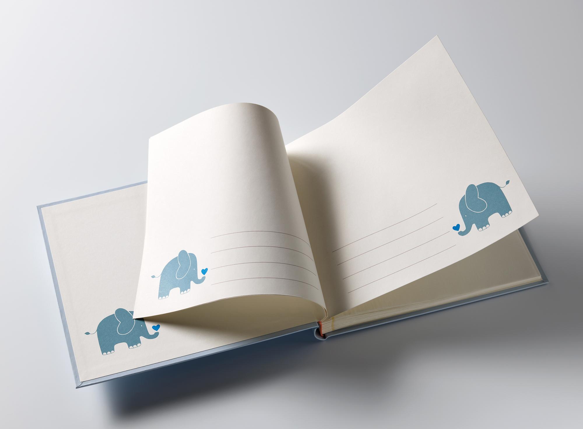 Stilrent og søtt er to nøkkelord som går igjen hos de fleste ferske foreldre. Her har vi et fint babyalbum som kan beskrives akkurat slik! På forsiden finnes teksten "Hello baby" sammen med et grafisk trykk som viser en elefantunge som holder i et hjerte. Inni finner du 50 hvite sider som du kan lage fine collager på.