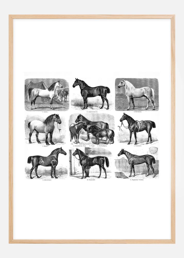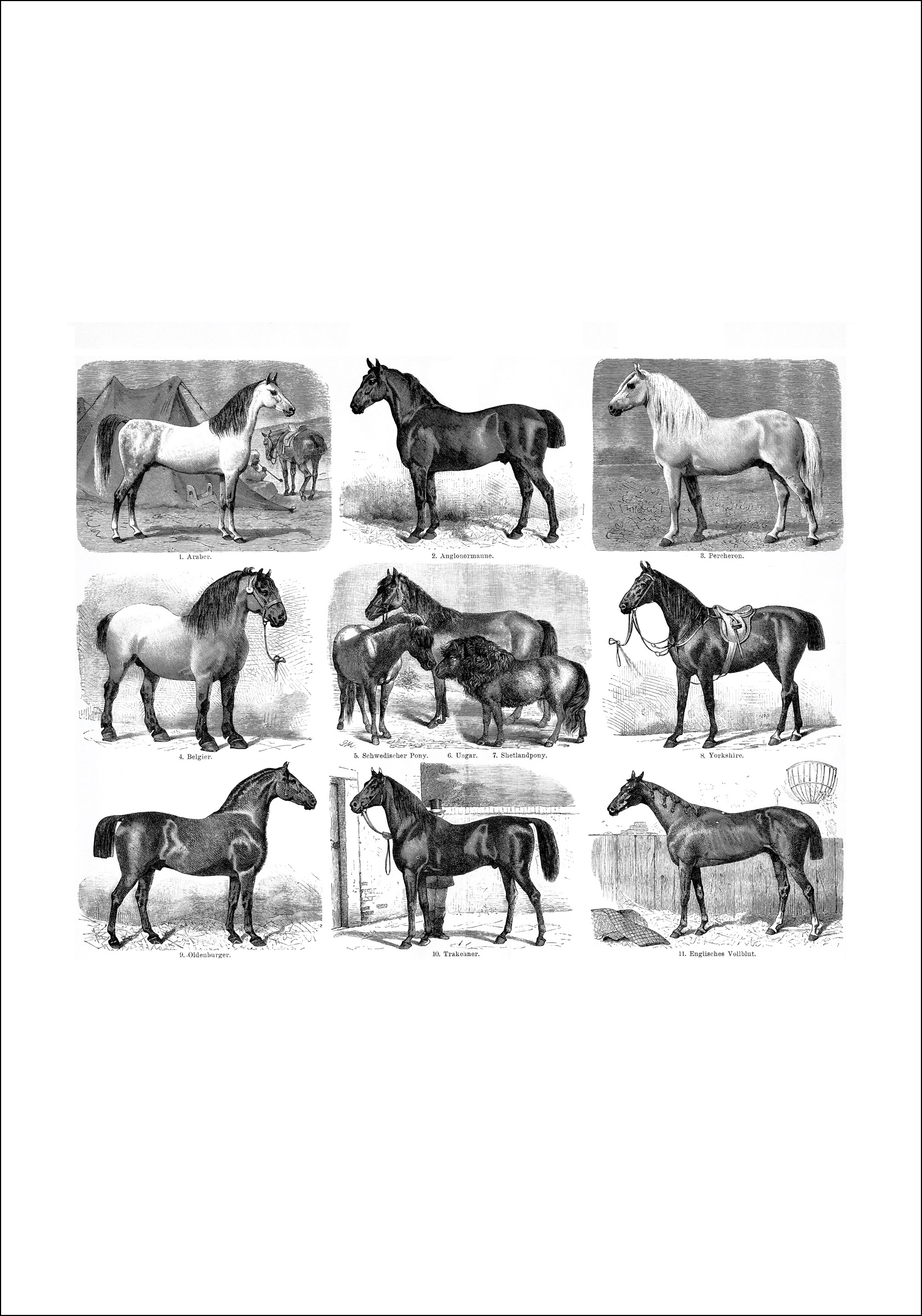 Kan du ikke få nok av hester har vi en vakker plakat med et motiv som viser ulike hesteraser. Under hvert bilde står navnet på rasene skrevet på engelsk. Ettersom plakaten er svarthvit er den enkel å kombinere med en ramme i en fin farge. Plakaten finnes i flere ulike størrelser som passer likegodt på en kommode som på veggen.