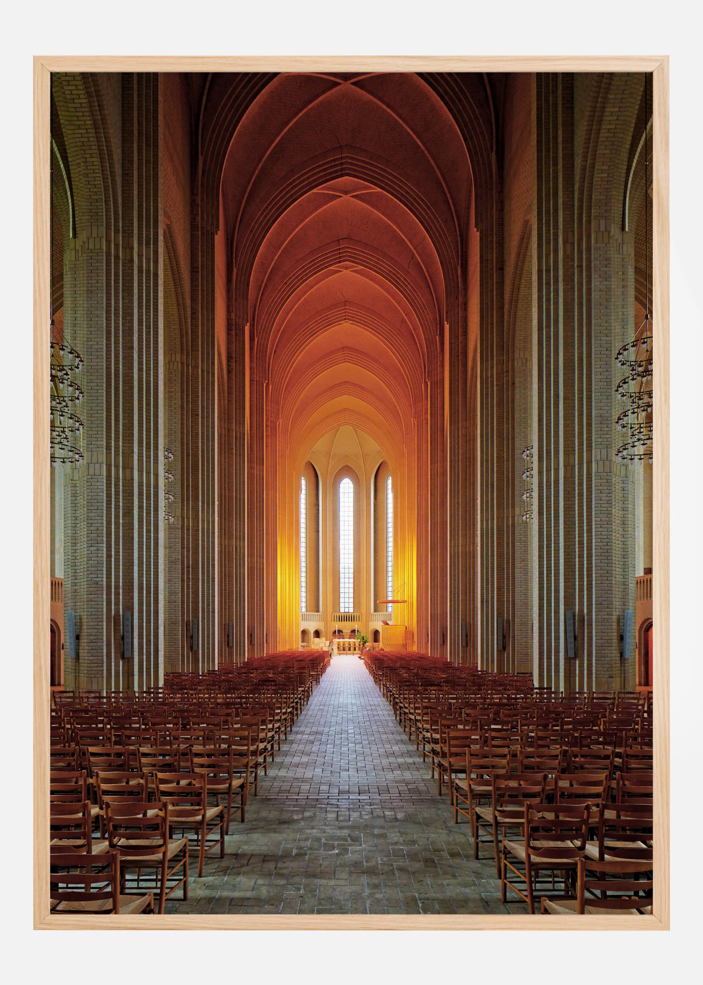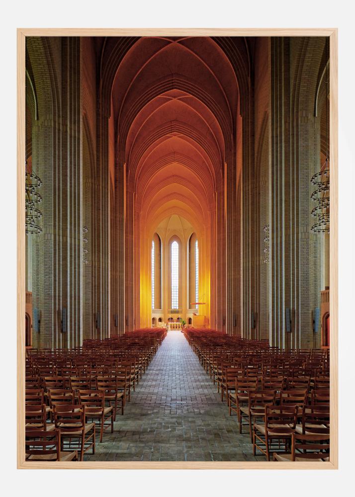 En fantastisk arkitektonisk plakat av innsiden av en kirke. Den lange midtgangen som fører opp til alteret, det høye taket og steinkolonnene gir en veldig fredelig følelse. Det lyse oransje lyset som reflekteres gjennom vinduene skaper en følelse av varme og harmoni. Føl fred og ro med denne plakaten.