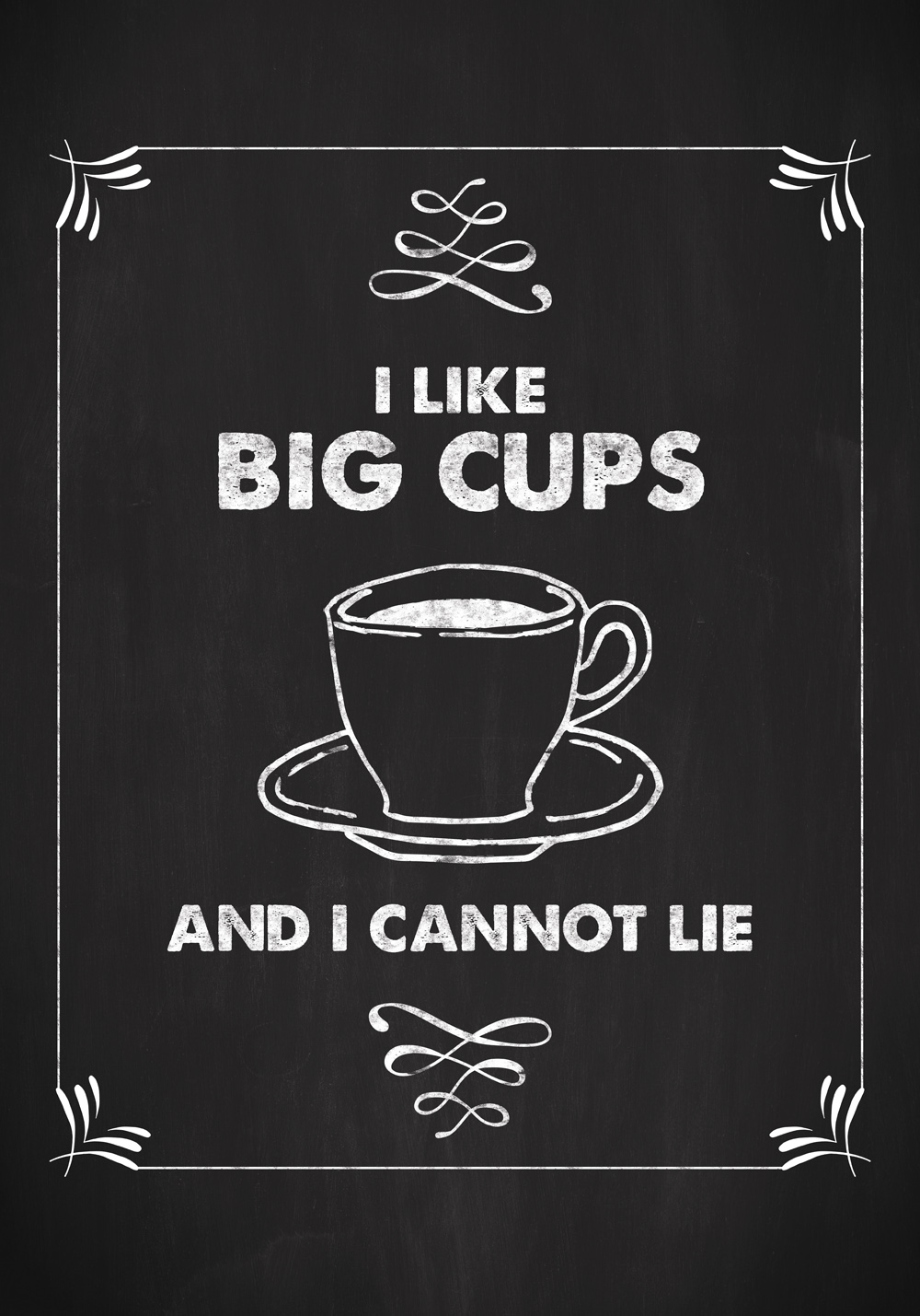 Smart print med budskapet - I like big cups, and I cannot lie, for den som liker store kopper kaffe eller te. Den svart-hvite postern, med følelsen av en krittavle, passer godt på en hylle i kjøkkenet sammen med kokebøker og matlagingsutstyr. Eller hvorfor ikke henge den sammen med andre grafiske prints på en bildevegg med et tema fra kjøkkenverdenen. Kompletter postern med en enkel svart ramme som lar teksten tale og som forsterker inntrykket av en skoletavle.
