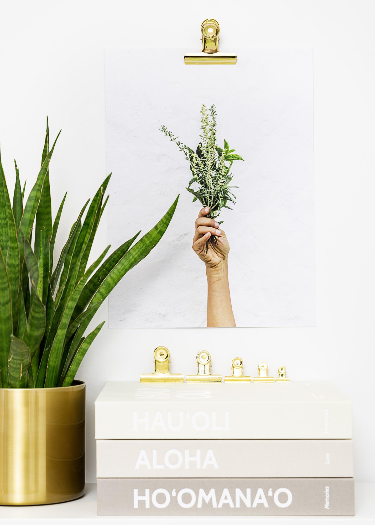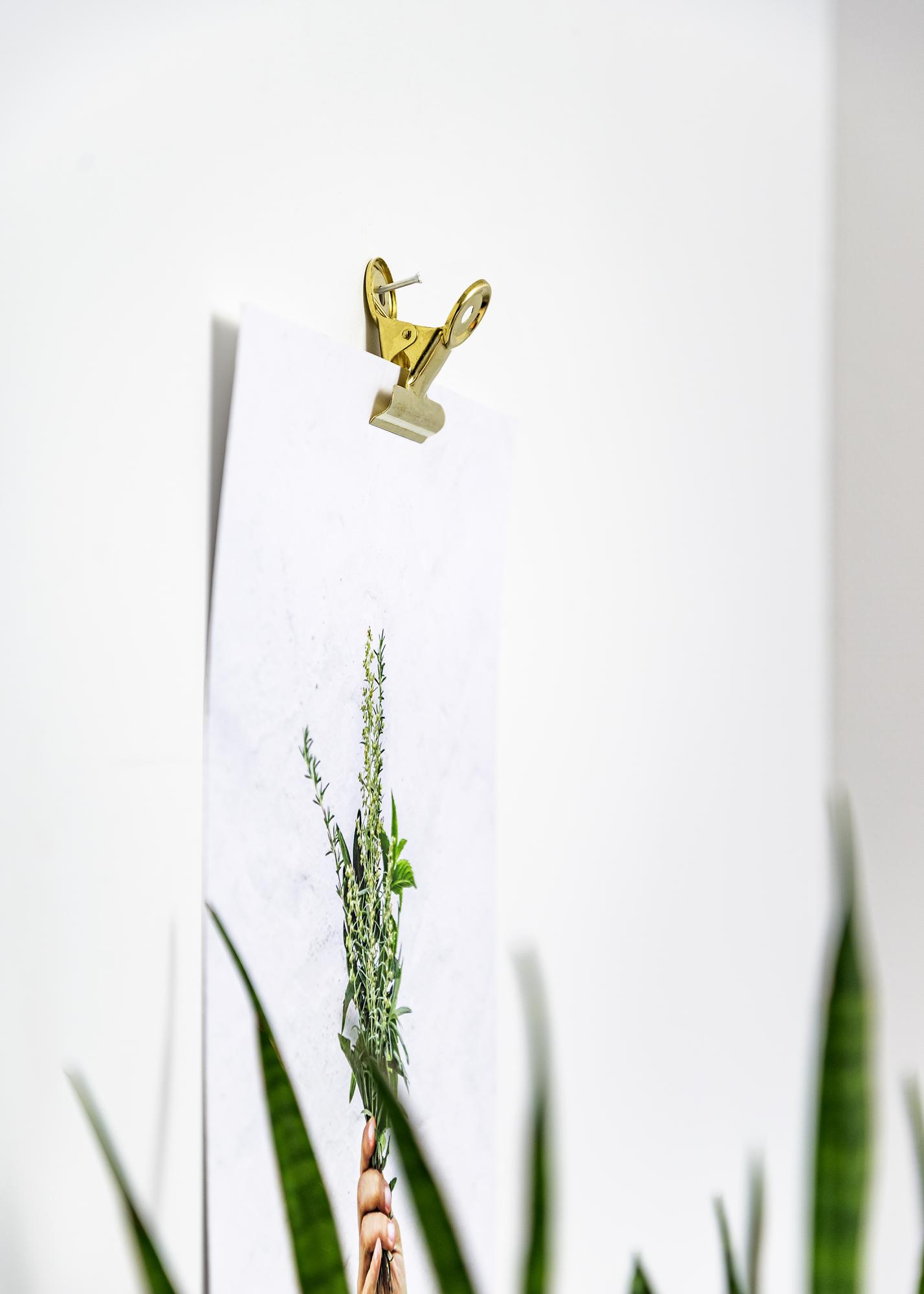 En metallklype i en elegant og blank gull finish og gir plakatene og printene dine en trendy og minimalistisk oppheng. Åpningen til klypen har et reelt som lar deg feste tynt papir, mens det også er mulig å bruke det til motiver med litt større tykkelse. Hvis du har en stor plakat du vil henge opp så kan du bruke to plakatklyper. Metallklypene har et stilrent design, og hullene i den runde delen av toppen av klypen gjør det enkelt og lett å henge det opp på veggen med en liten spiker eller skrue.