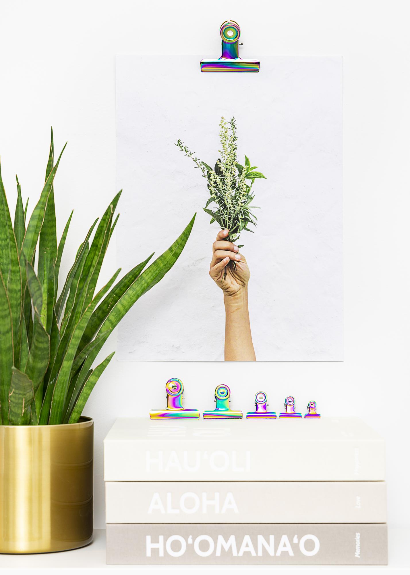En fin regnbuefarget metallklype i en blank overflate som gir plakatene og printene dine og litt annerledes oppheng. Plakatklypen er sterk, men fleksibel, med åpning som gjør at du kan feste det tynneste papiret samt plakater med litt tykkere tykkelse. Har du en stor plakat som du vil henge opp, er det bare å bruke to metallklyper. Posterklypenes design er enkelt og stilrent, og takket være hullene klypens runde topp kan du enkelt henge den på veggen ved hjelp av en liten spiker eller skrue.