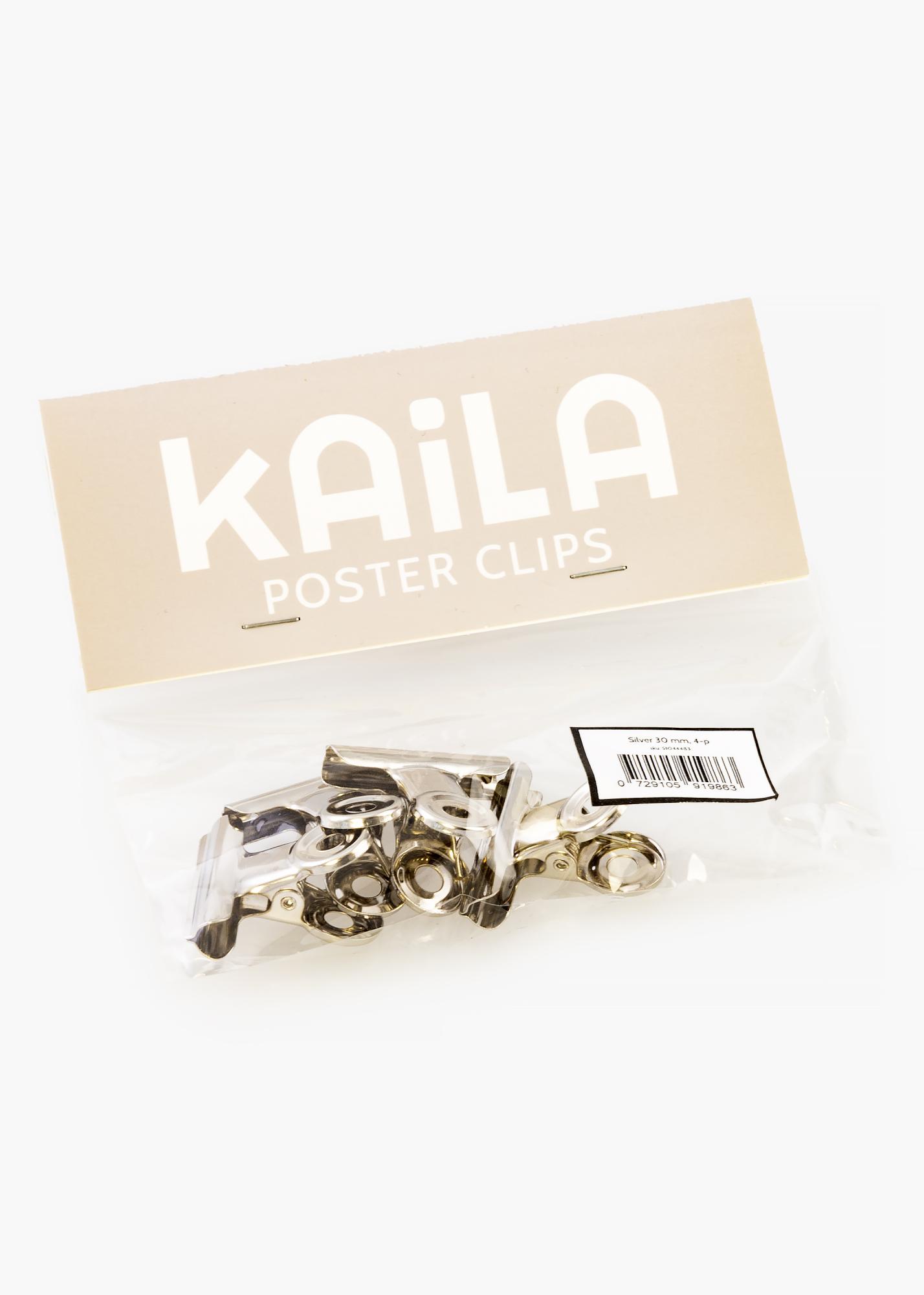Denne metallklypen har en moderne og blank sølv finish og er det perfekte verktøyet for å skape ett trendy og minimalistisk oppheng av plakater og print. Klypenes fleksible og riktige åpningsgrep lar deg henge motiver med varierende tykkelse, til og med det tynneste papiret. Har du en stor plakat så bruker du bare to klyper. Posterklypenes design er stilrent og enkelt, og hullene i klypens runde topp gjør monteringen på veggen enkel og grei - alt du trenger er en liten spiker eller skrue.