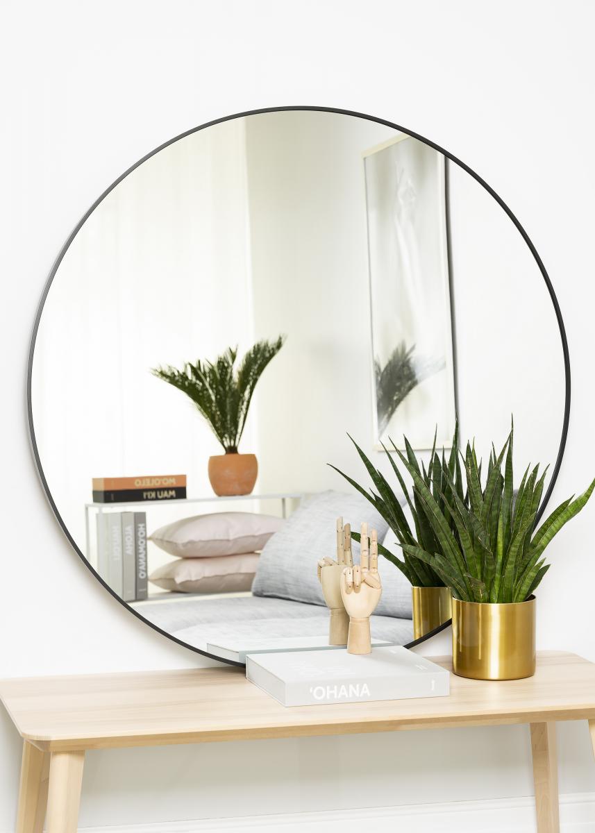 KAILA Round Mirror Edge Black er et rundt speil med en stilig og tynn metallramme i matt svart farge, noe som gir det et industrielt og trendy utseende. Rammen har - avhengig av størrelsen - en dybde på mellom 30-40 mm, noe som gjør at speilglasset stikker litt ut fra veggen og skaper en stilig 3D-effekt. Dybden på rammen gjør også at speilet føles solid samtidig som det opprettholder det minimalistiske utseendet. Et perfekt rundt speil som kan plasseres i hvilket som helst rom hvor du vil tilføre både funksjon og stilig svensk design!