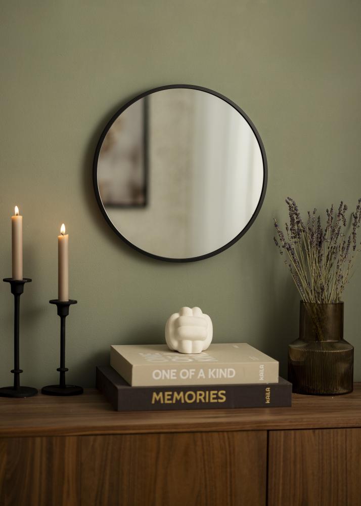 KAILA Round Mirror Edge Black er et rundt speil med en stilig tynn metallramme i en matt svart farge, noe som gir det et industrielt og trendy utseende. Rammen har - avhengig av størrelse - en dybde på mellom 30-40 mm, noe som gjør at speilglasset stikker et stykke ut fra veggen og skaper en stilig 3D-effekt. Dybden på rammen gjør også at speilet føles solid samtidig som det opprettholder en minimalistisk stil. Et perfekt rundt speil som kan plasseres i hvilket som helst rom hvor du vil tilføre både funksjon og stilig svensk design!