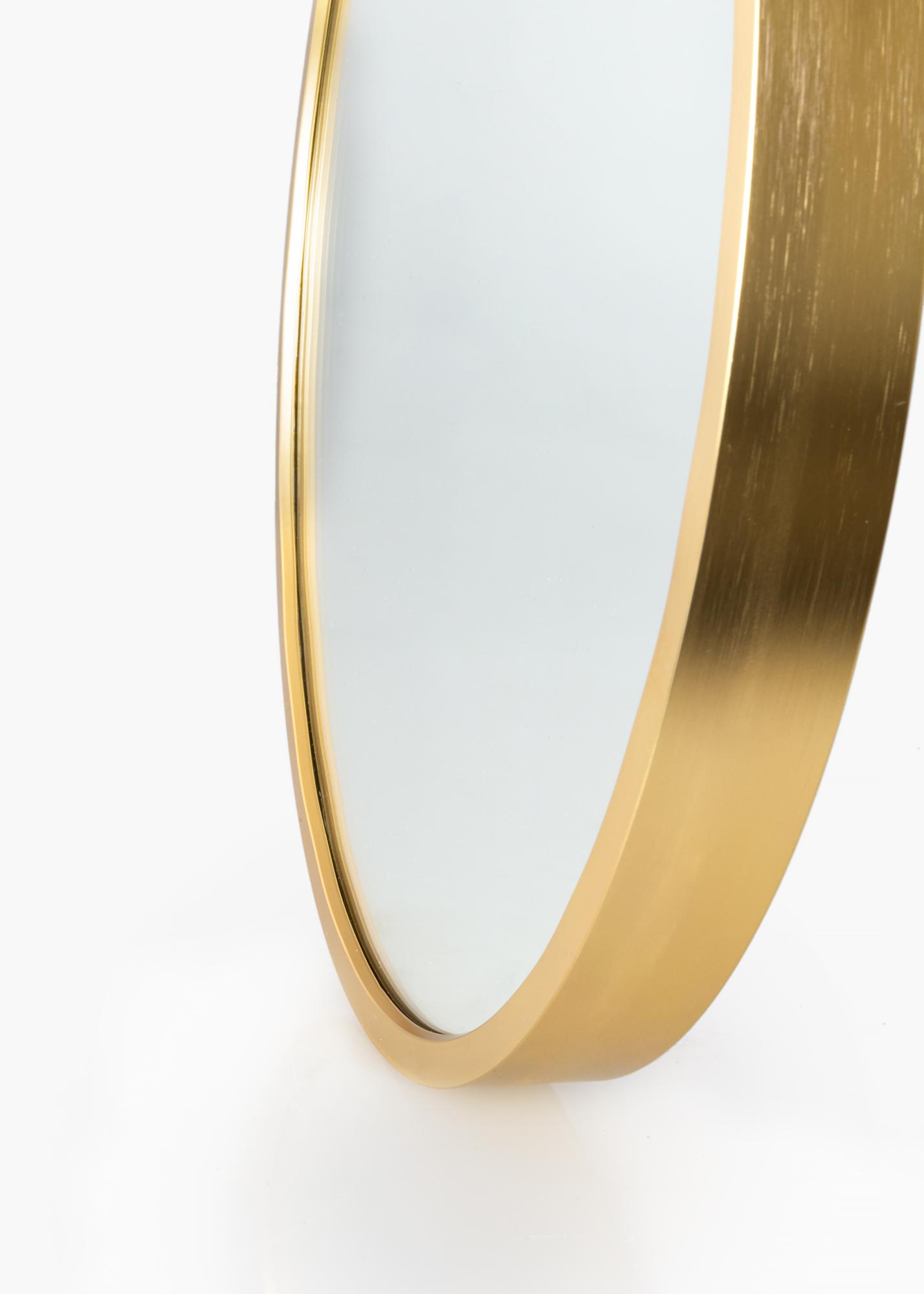Et rundt speil i stilig svensk design med en metallramme i vakker gullfinish. Rammen har en børstet overflate, noe som gir et litt mattere utseende på den vakre gullfargen. Rammen er også trendy tynn, men har samtidig - avhengig av størrelse - en dybde på mellom 30-40 mm, noe som gjør at den stikker litt ut fra veggen og skaper en stilig 3D-effekt. Rammens dybde gjør også at speilet føles solid og robust, uten at det reduserer den minimalistiske følelsen på speilet.