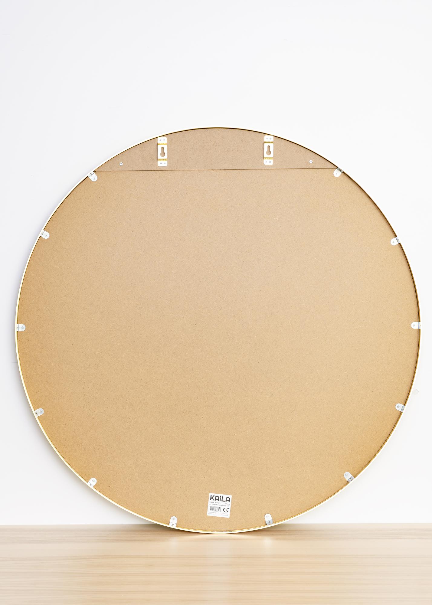 KAILA Round Mirror Edge Gold er tilgjengelig i flere forskjellige størrelser, og dette speilet har en diameter på 110 cm. Speilets bakside er utstyrt med to veggfester for enkelt og stabilt oppheng på veggen, og leveres med egnede skruer og plugger.