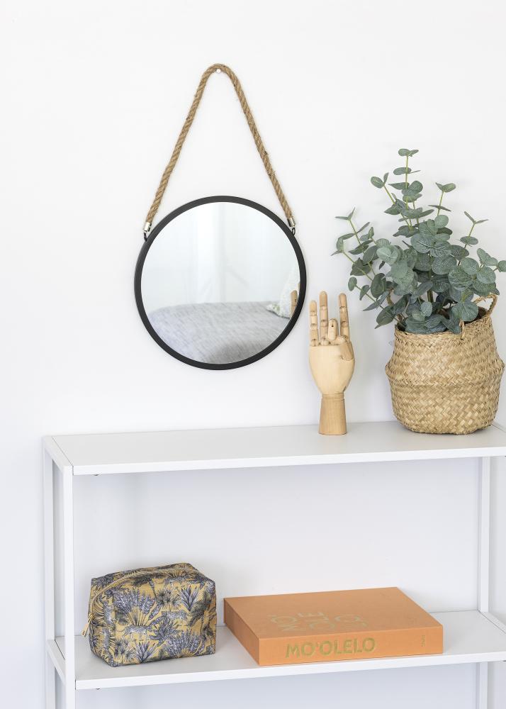 Her er et rundt vegg speil perfekt for deg som er tiltrukket av en maritim inspirert innredning! Speilet er laget av metall og har et dekorativt tau i hamp for en dekorativ opphengning. Veggfeste er inkludert. Speilets glass er innrammet av en svart kant som gir speilet en stilig dybde. Speilet måler 30 cm i diameter.