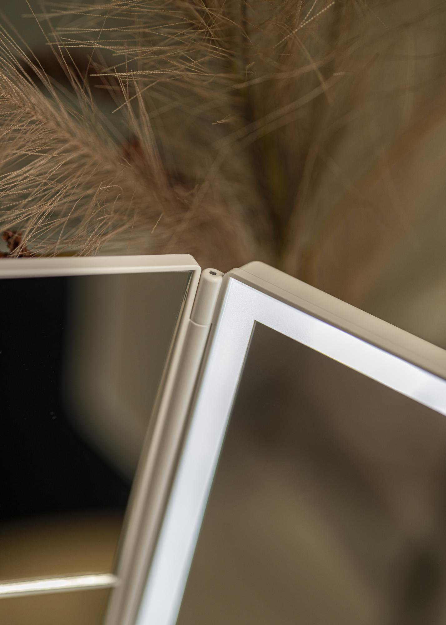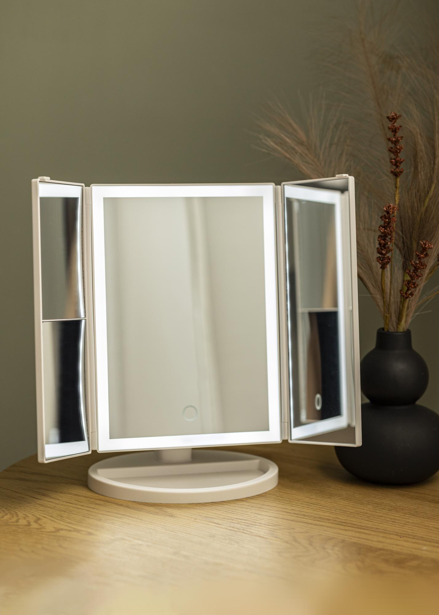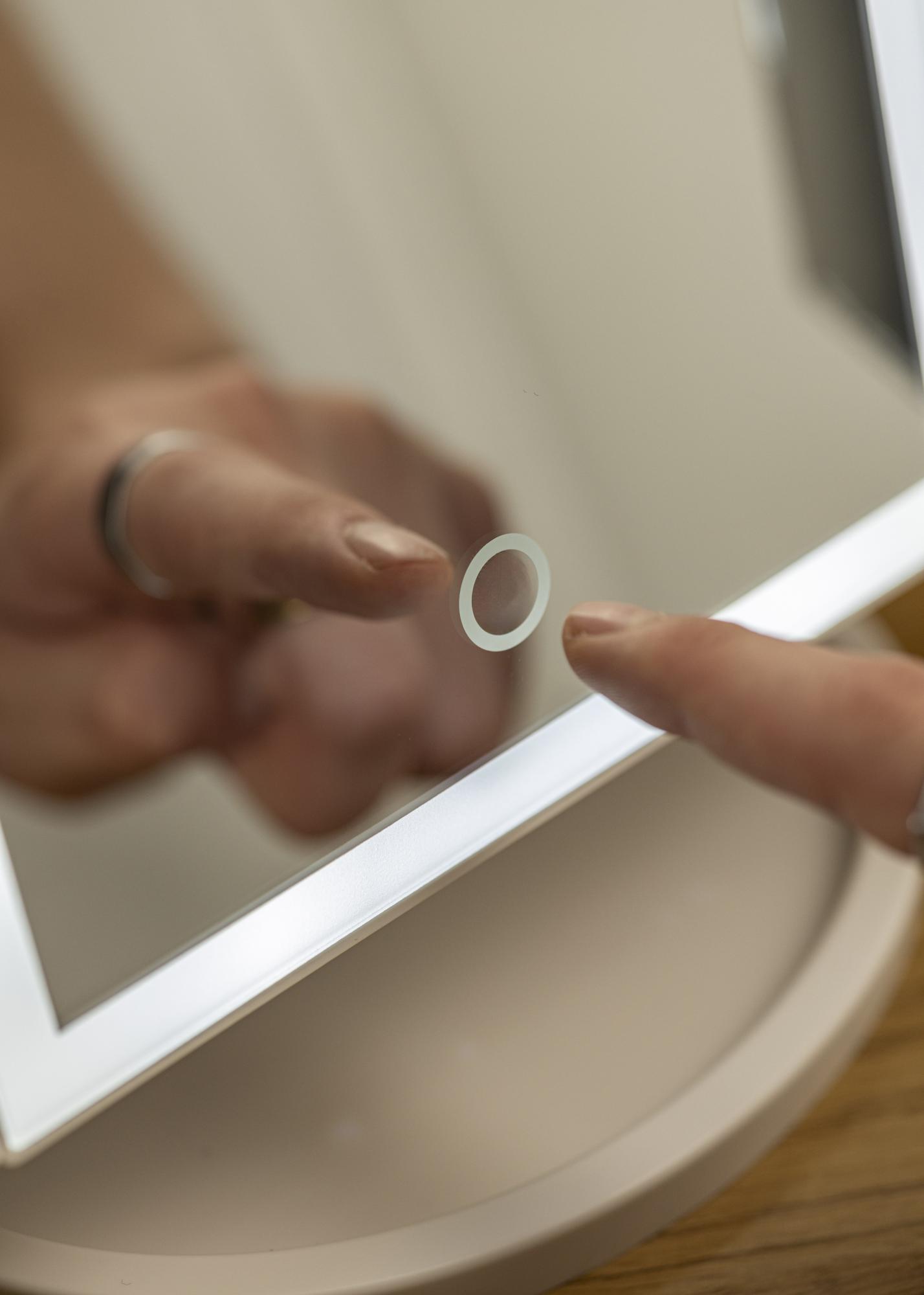 Ett trendy og stilig sminkespeil på en fot med fire forskjellige speil og dimbar LED-belysning. Venstre side av sminkespeilet har et forstørrende speilglass med 2x og 3x zoom. Den integrerte LED-belysningen rammer inn det større speilet i midten og gir en behagelig varm glød i 3000K. Du kan enkelt slå på belysningen ved å trykke på berøringsknappen på skjermen og enkelt justere lysstyrken på lyset ved å holde knappen nede i noen sekunder. Speilet er 38x30 cm og kan endre vinkel, noe som gir deg muligheten til å speile deg fra forskjellige vinkler.