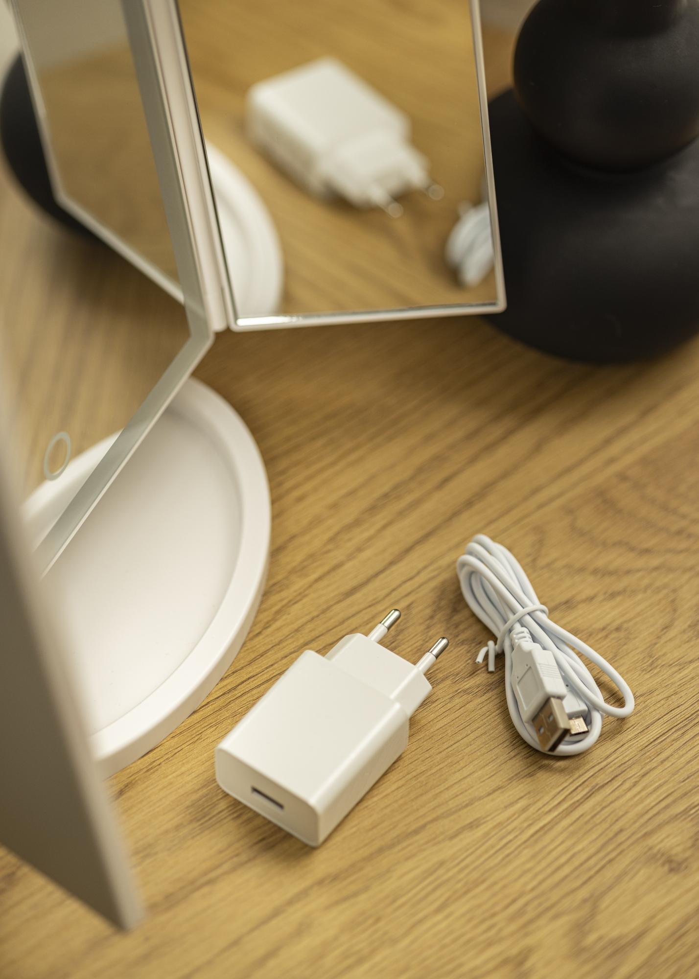 Speilet drives av 4x AA batterier (medfølger ikke), eller lades med medfølgende USB kabel og veggadapter.