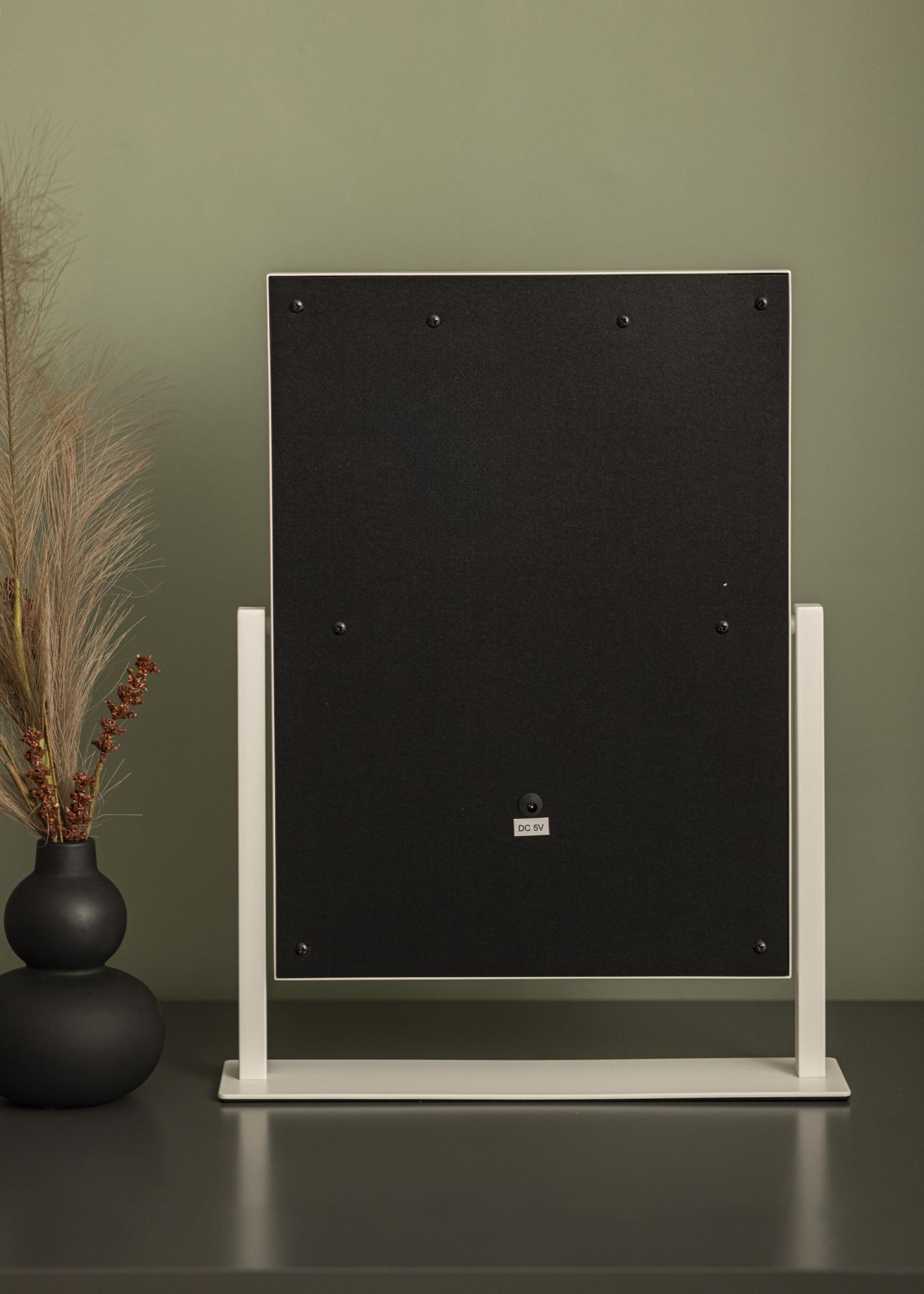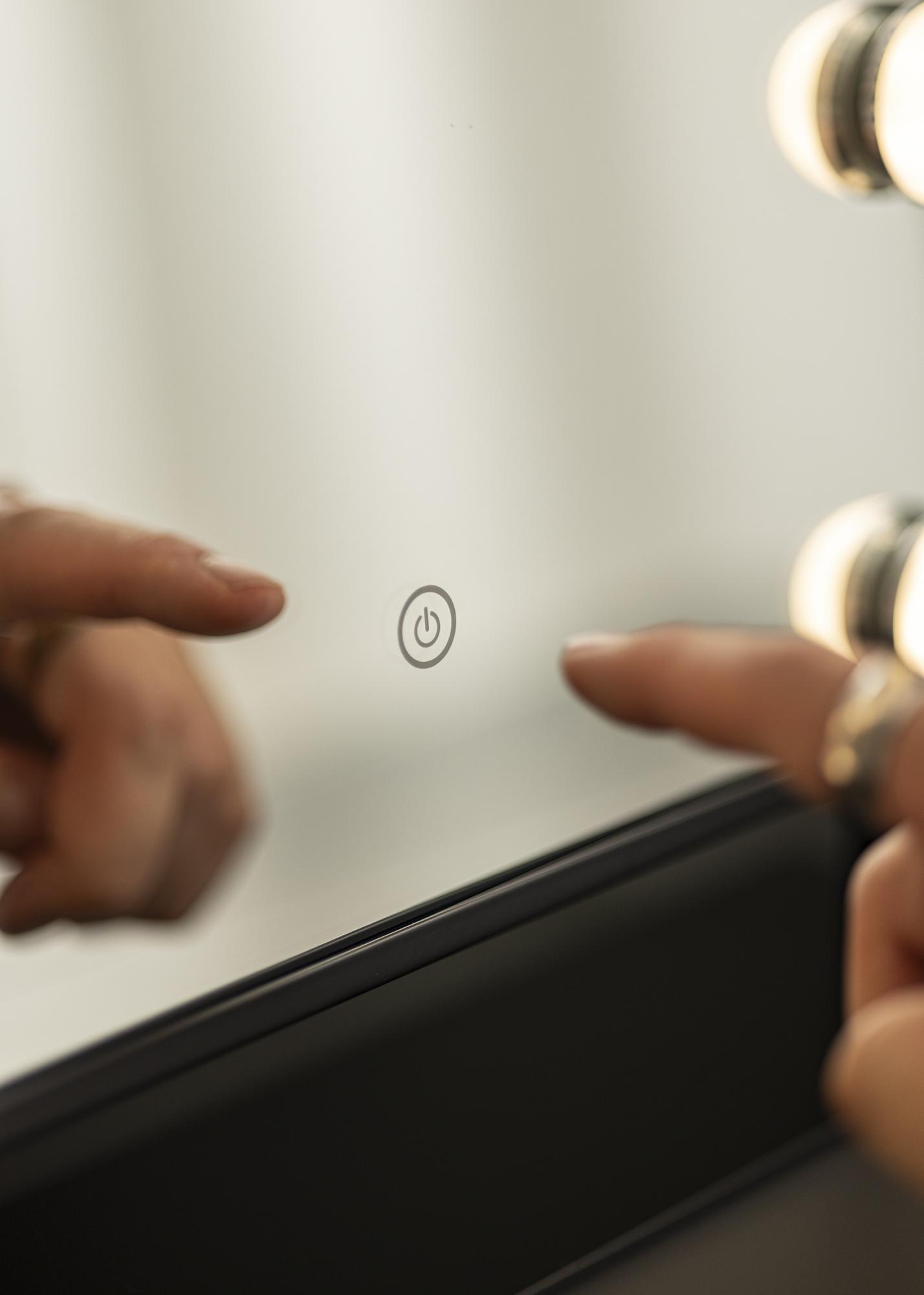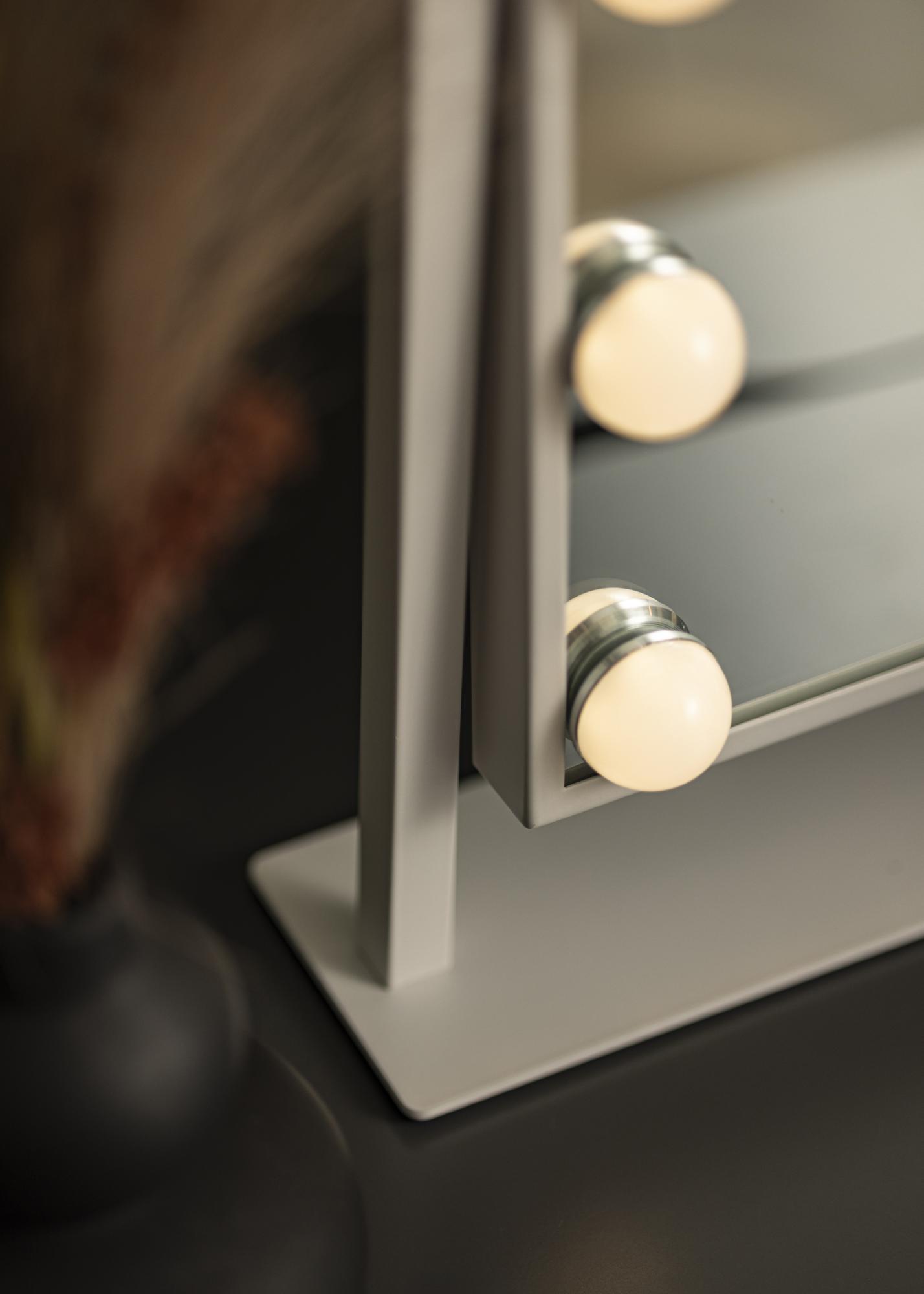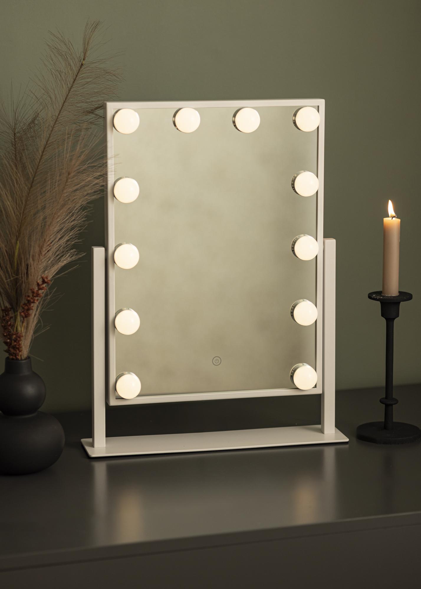 Dette er et sminkespeil i luksuriøs design med 12 dekorative LED-lyspærer i en elegant hvit nyanse. Lyspærene rammer stilfullt den sjenerøse speiloverflaten som måler 30x40 cm og gir en varm hvit glød i 3000K. Belysningen slås på ved å trykke på berøringsknappen på skjermen og har en dimbar funksjon som du enkelt kan justere ved å holde knappen nede i noen sekunder. Speilet kan vinkles vertikalt slik at du enkelt kan sminke deg fra den vinkelen som passer deg best. I tillegg til de mange funksjonene, blir dette sminkespeilet en elegant detalj og skaper en ekte Hollywood-følelse i hjemmet ditt!