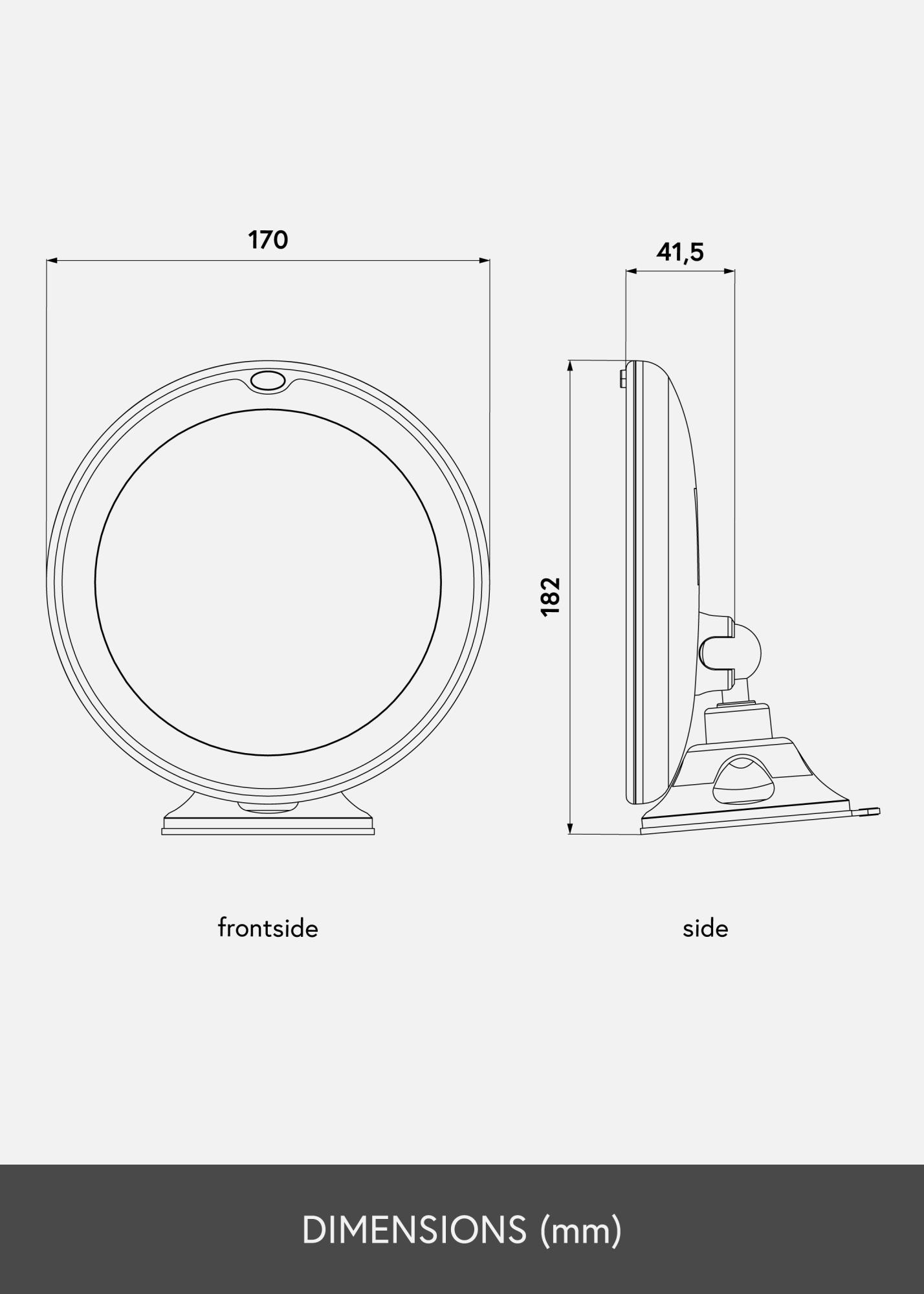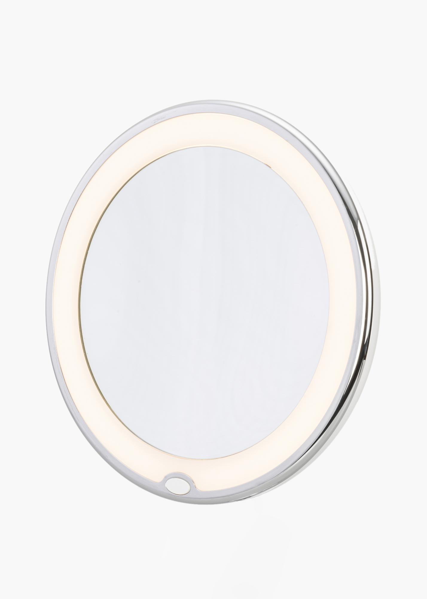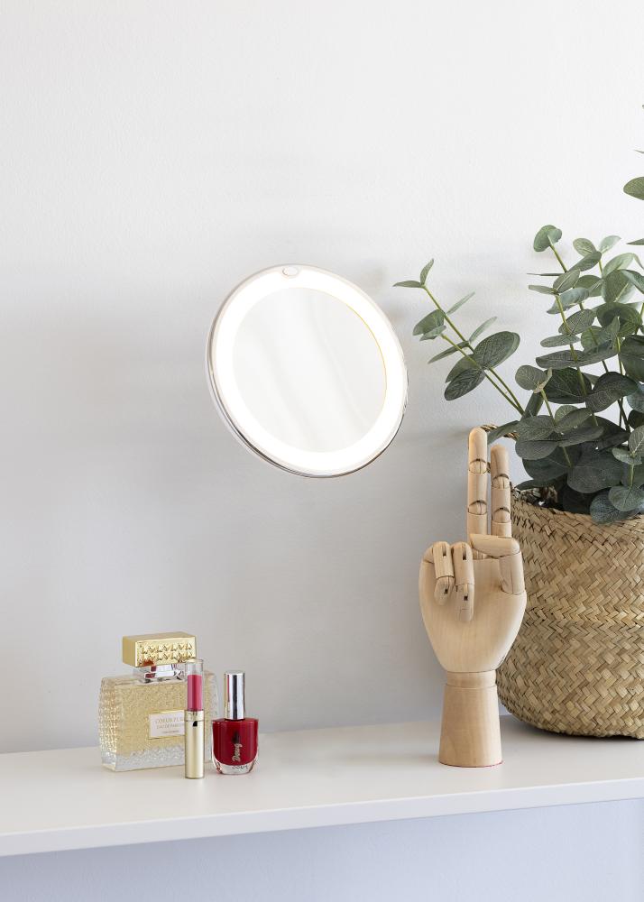 Dette er et klassisk speil fra KAILA i fleksibel design. Det elegante speilet har en integrert LED-belysning som rammer inn speilglasset. Badespeilet måler 17 cm i diameter og har et forstørrelsesglass med 5x zoom. Med andre ord, dette speilet er flott for å se et skarpt nærbilde av ansiktet ditt! Speilet er dekorativt som en interiørdetalj, men det fleksible designet gjør at speilet lett kan gjemmes bort når det ikke er i bruk. Speilet er festet til veggen, flisen eller bordet med tilhørende sugeplugg. Pluggen er låsbar og sørger for at speilet er stabilt. Levert umontert.