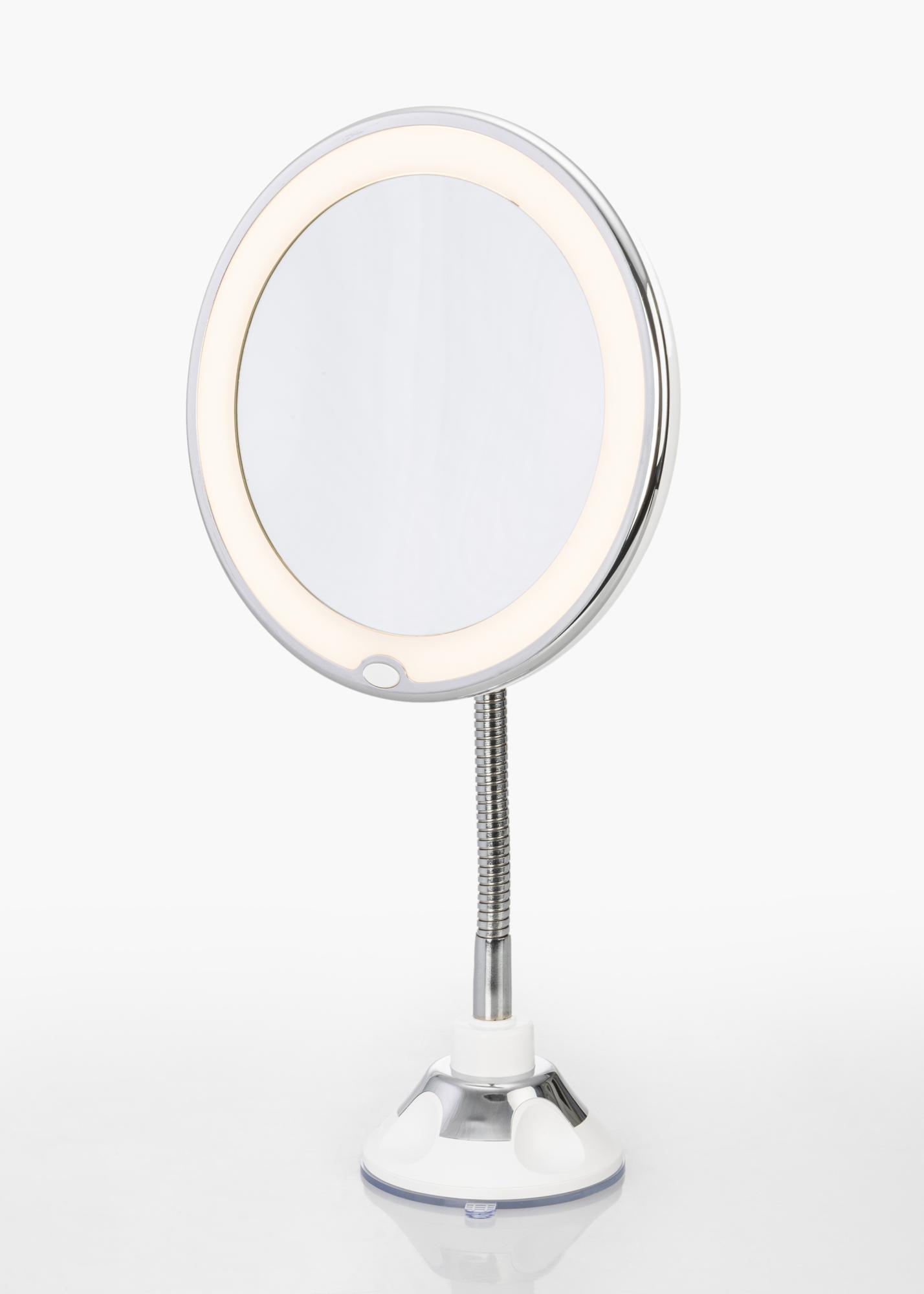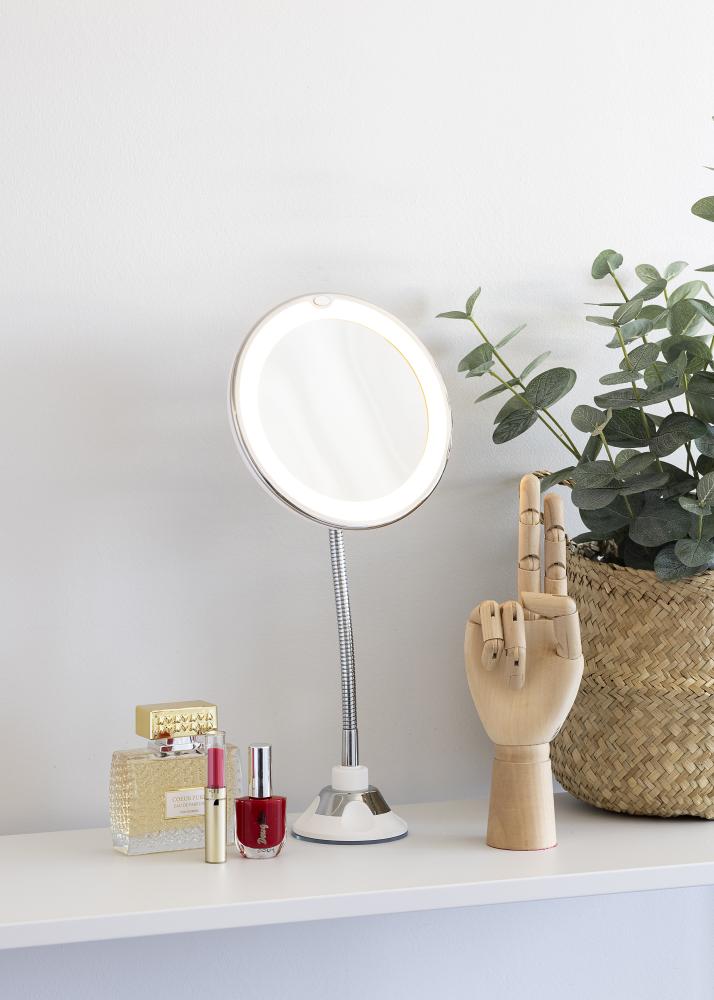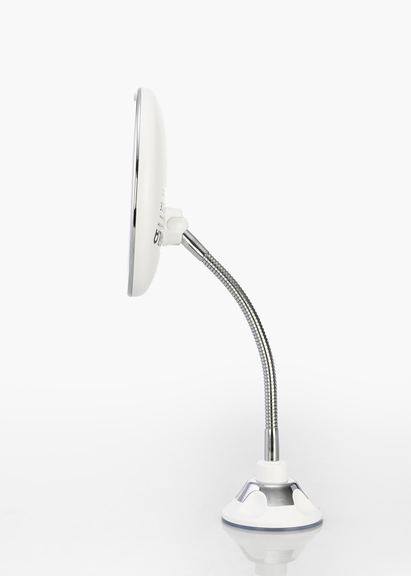 Den tilhørende foten av speilet er bevegelig, noe som betyr at du kan bøye speilet i den vinkelen du ønsker. Speilet er godkjent for bad. Speilet er festet til veggen, flisen eller bordet med tilhørende sugeplugg. Sugepluggen er låsbar og sørger for at speilet er stabilt. Levert umontert.