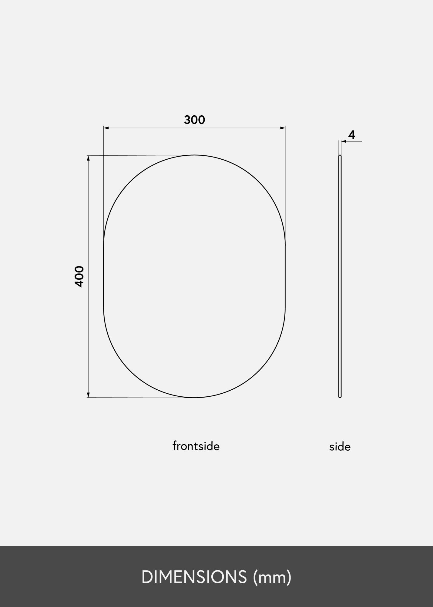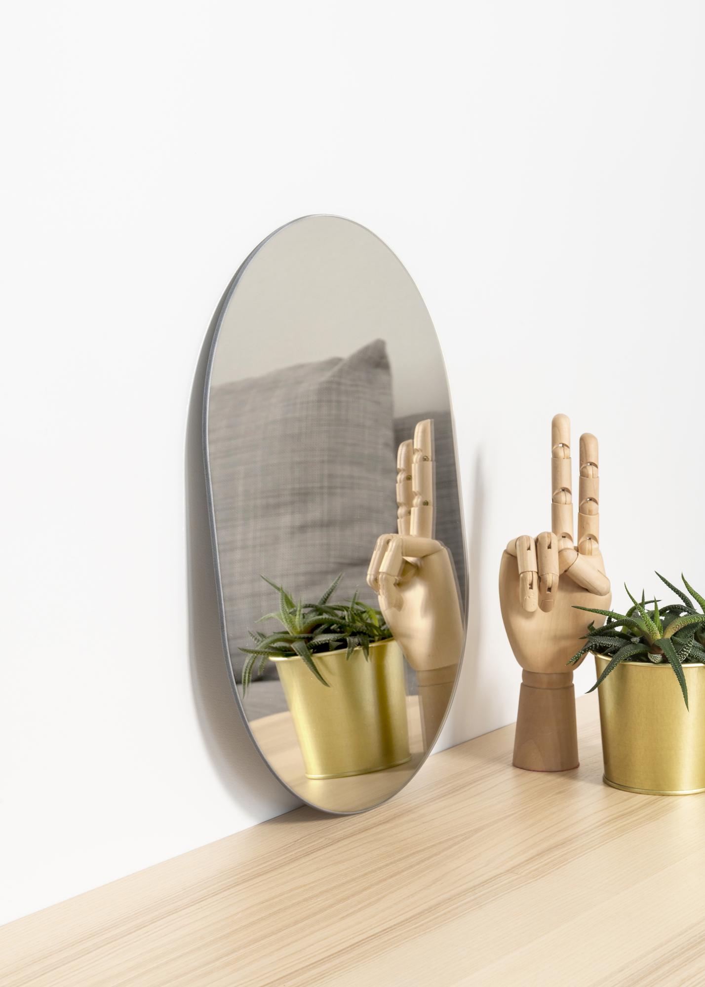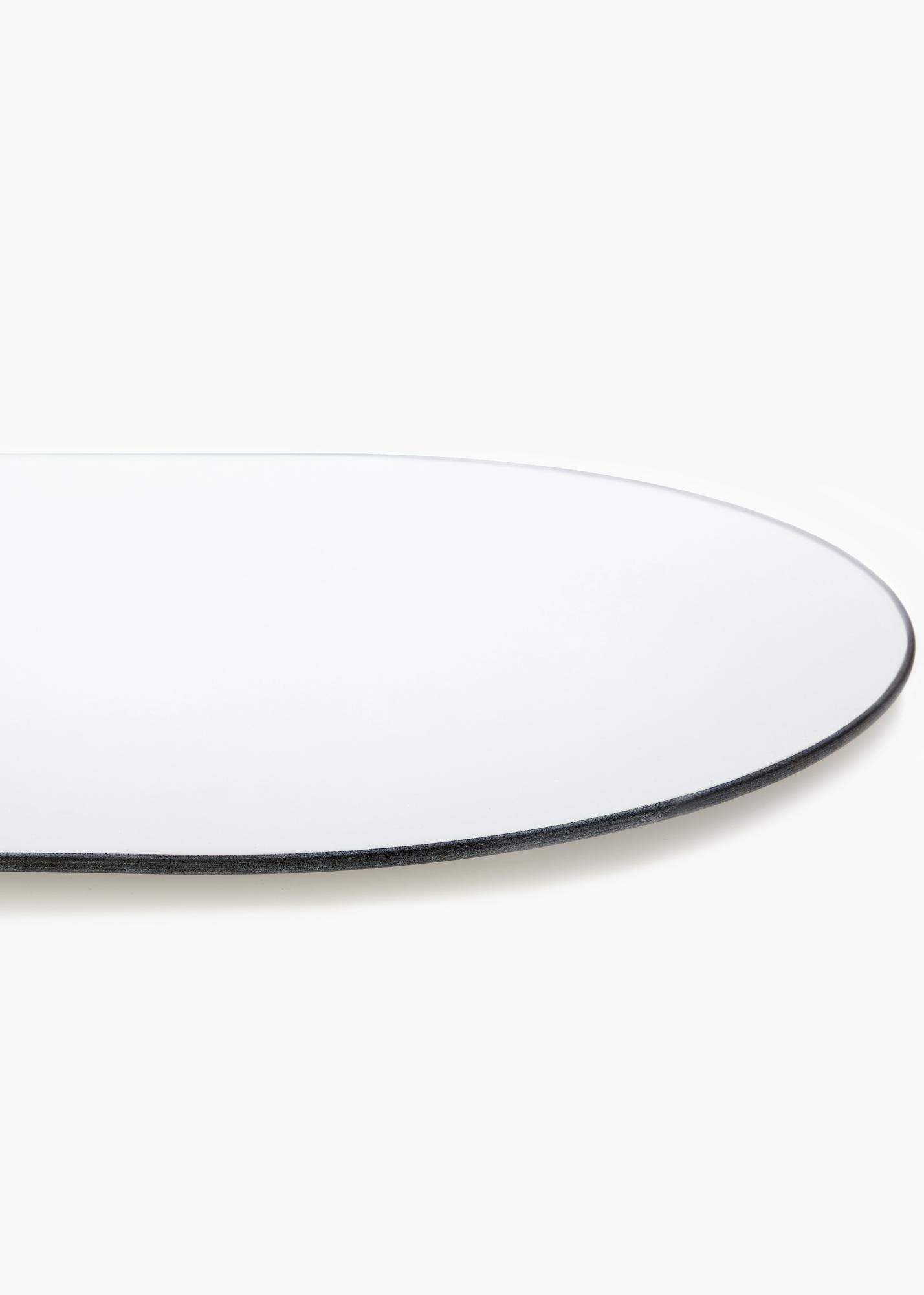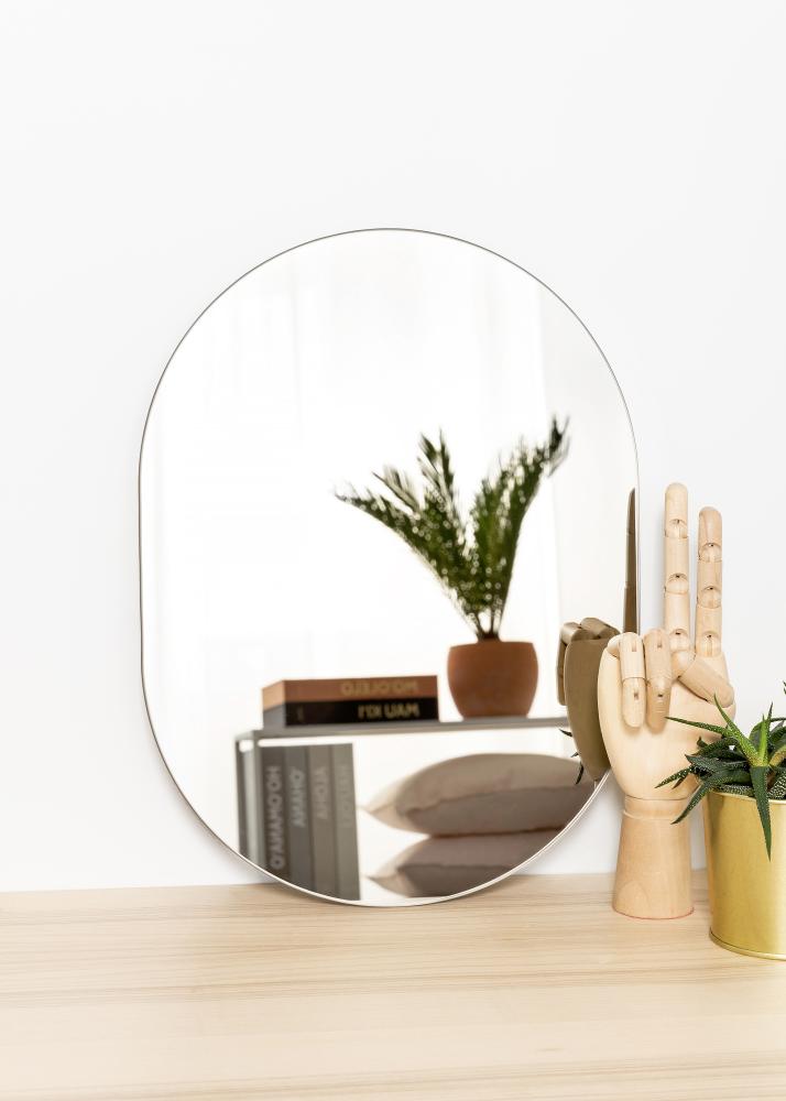 Et ovalt speil har like praktiske dimensjoner som et rektangulært speil, men har likevel den samme elegansen som et rundt speil - med andre ord en helt utmerket speilform! Dette ovale speilet er dessuten veldig tynt og har ingen ramme, noe som ytterligere forsterker den elegante fremtoningen.