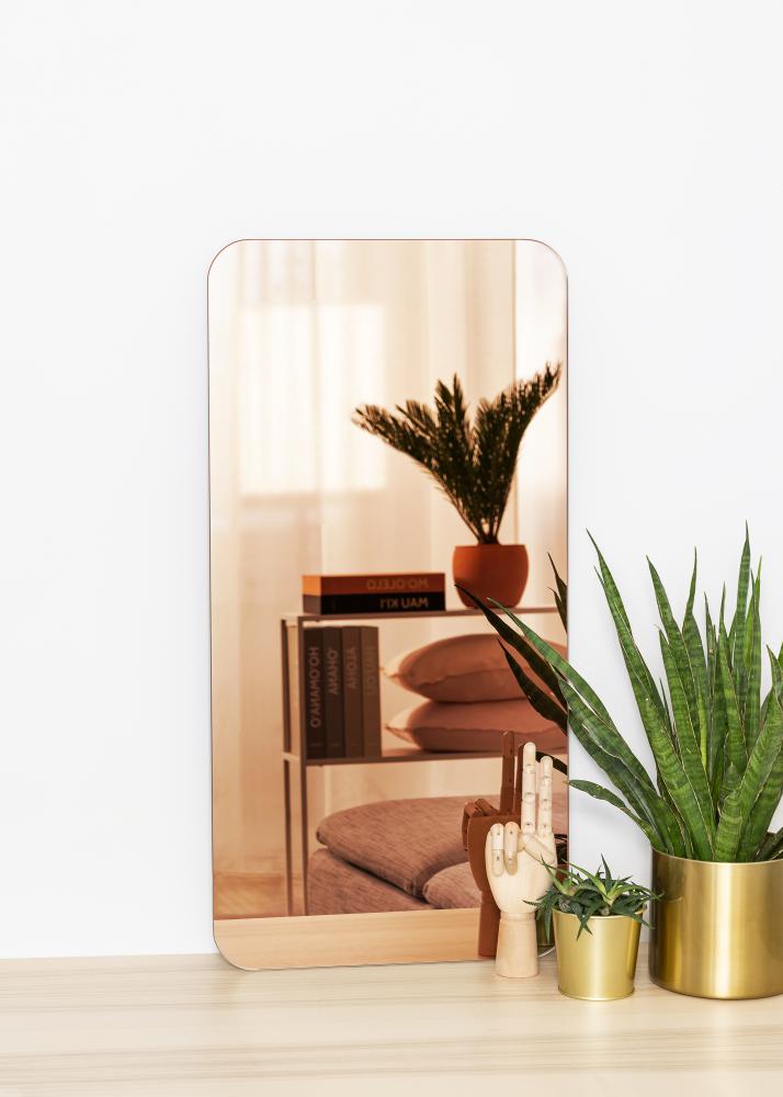 Dette rektangulære speilet er utstyrt med dekorative og avrundede hjørner. Denne detaljen gjør at helhetsinntrykket til speilet øyeblikkelig mykes opp og sørger for en elegant fremtoning. Speilet har i tillegg et roségullfarget speilglass, som gjør det veldig iøynefallende og moderne. Ytterligere detaljer som forsterker den moderne følelsen på speilet, er at det ikke har ramme og at det bare er 4 mm tykt. Til sammen resulterer dette i et veggspeil som er både en funksjonell og trendy interiørdetalj på én og samme tid!