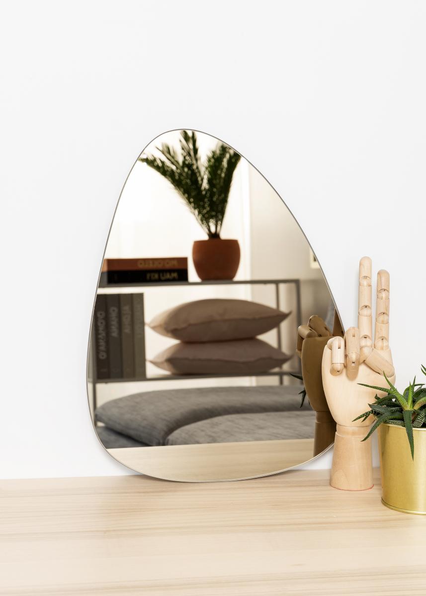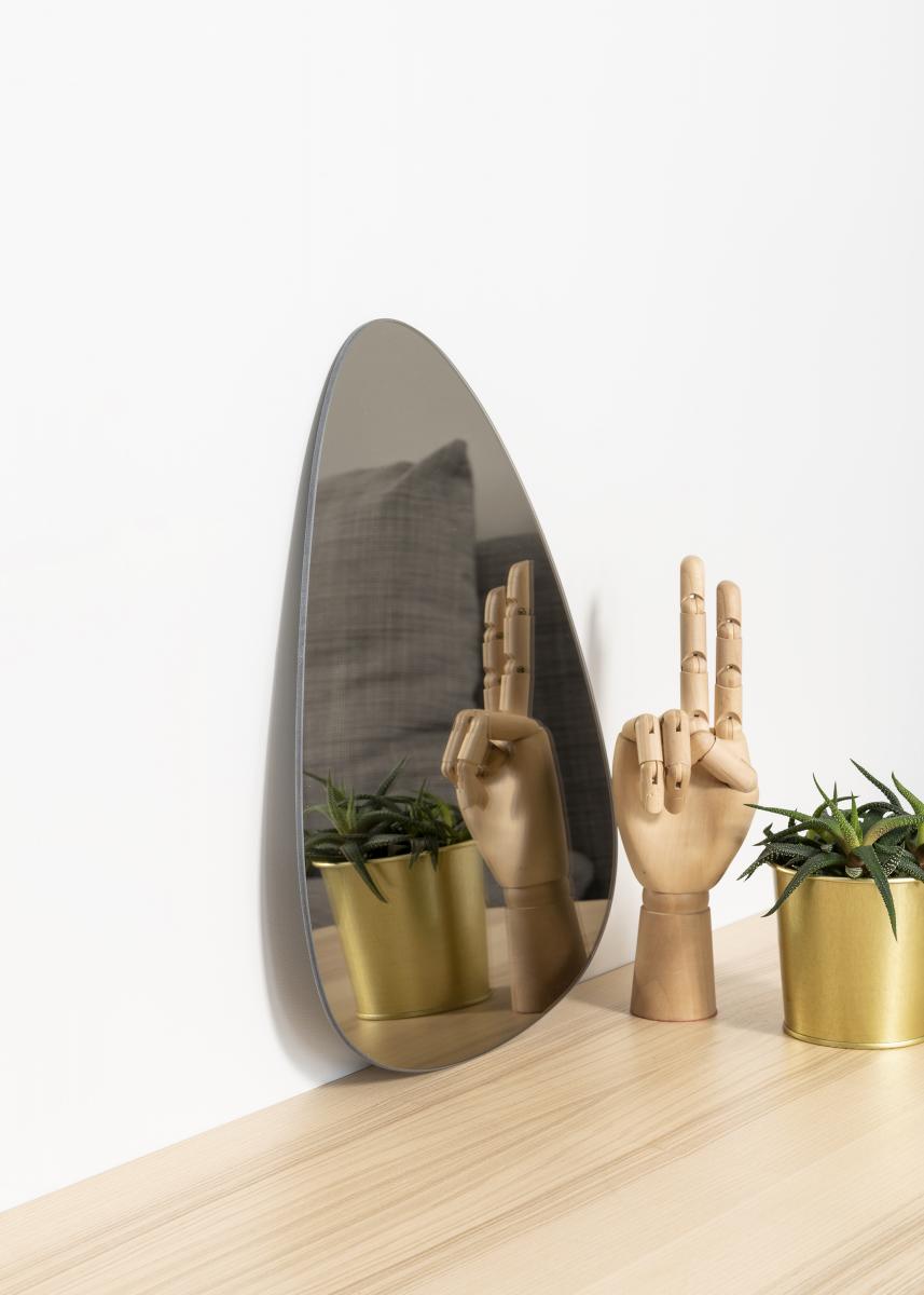 Dette asymmetriske speilet blir en skikkelig pen og trendy interiørdetalj i hjemmet ditt! I tillegg til det spennende og eggformede designet, har speilet også et stilig bronsefarget speilglass som forsterker det moderne utseendet ytterligere - og harmoniserer vakkert med mange andre farger. Den myke formen kombinert med det faktum at speilet er veldig tynt og mangler ramme, gir dette et ekstra elegant og flott utseende. Perfekt som funksjonell og trendy veggdekor i stuen, gangen eller på soverommet.