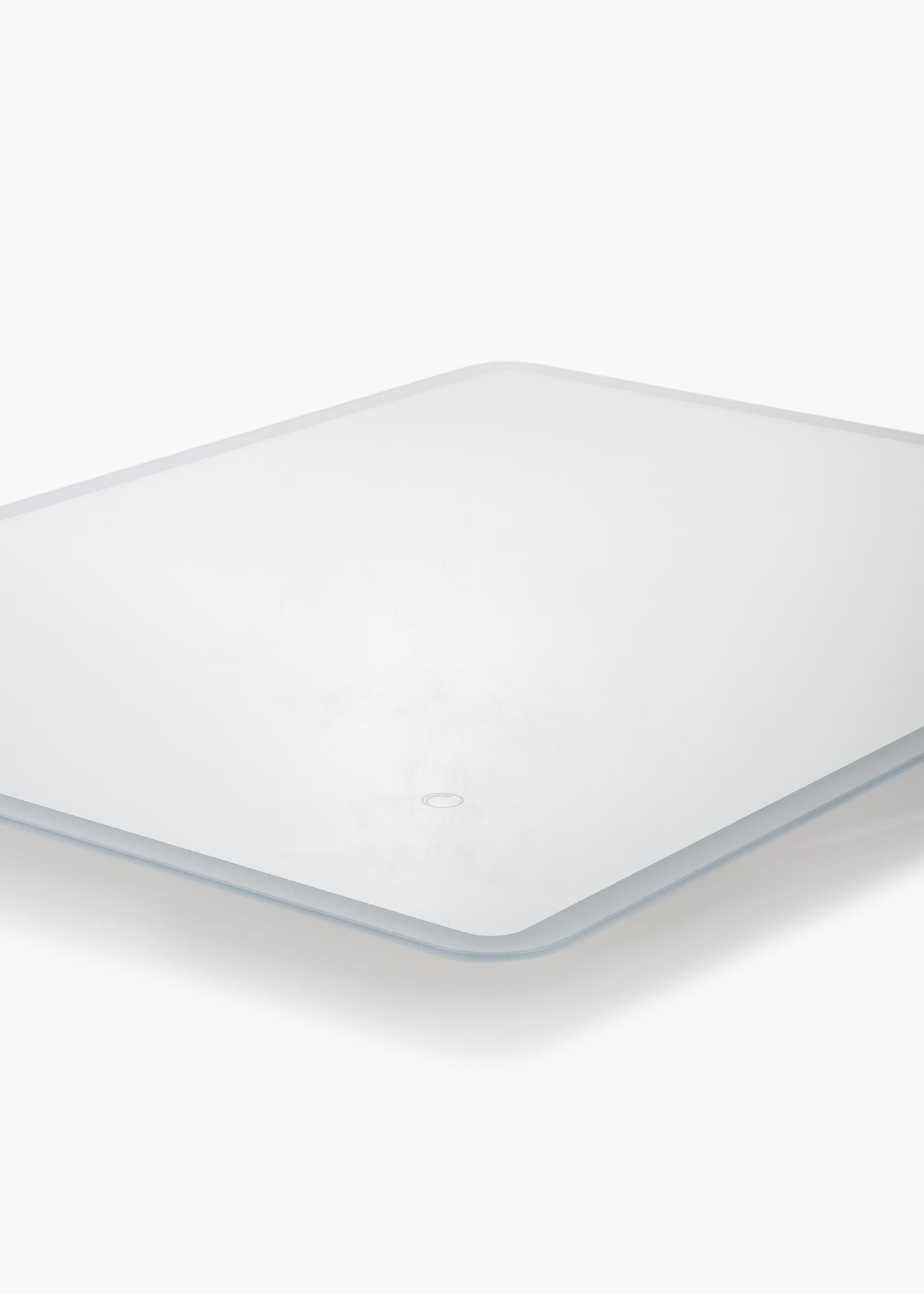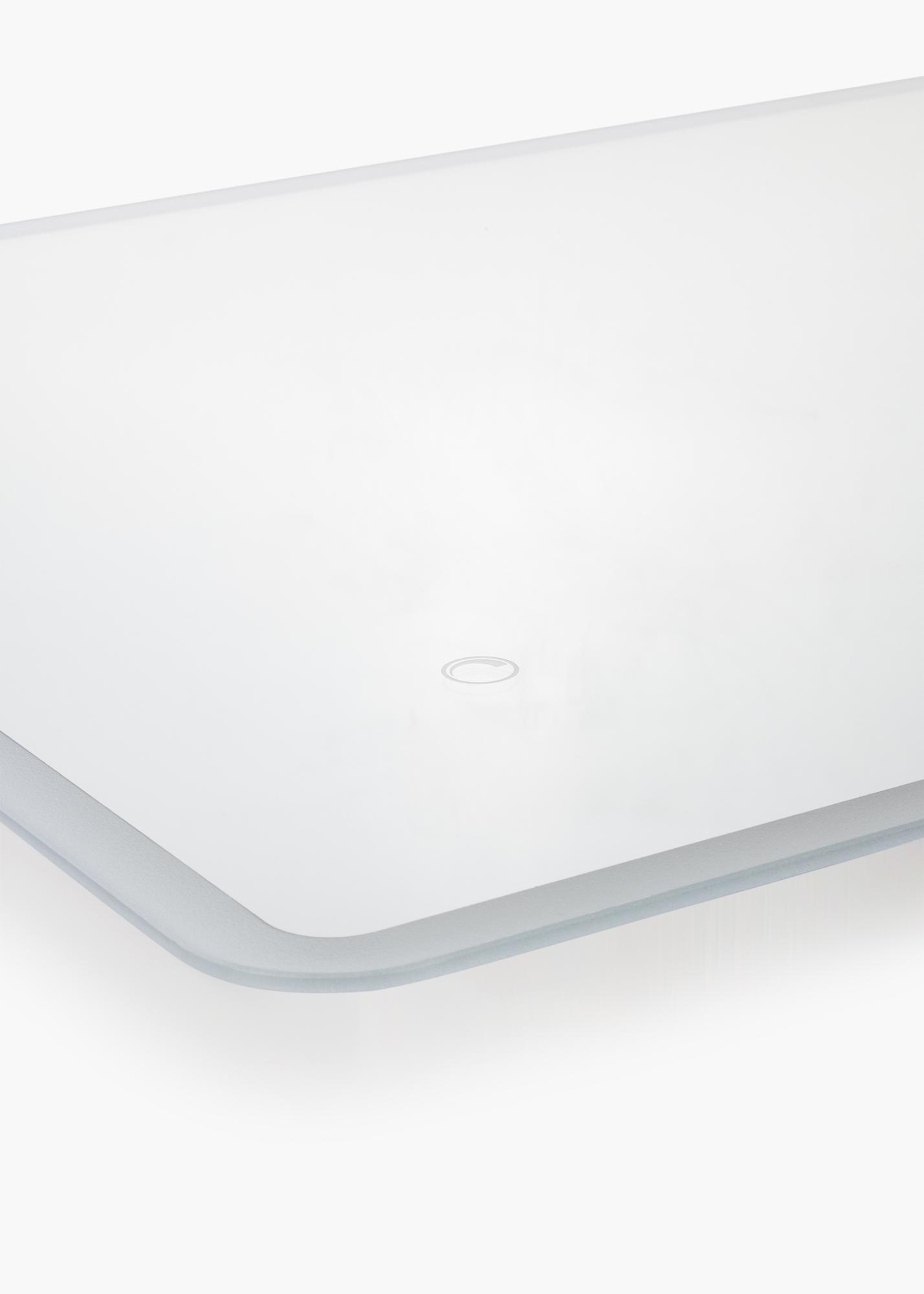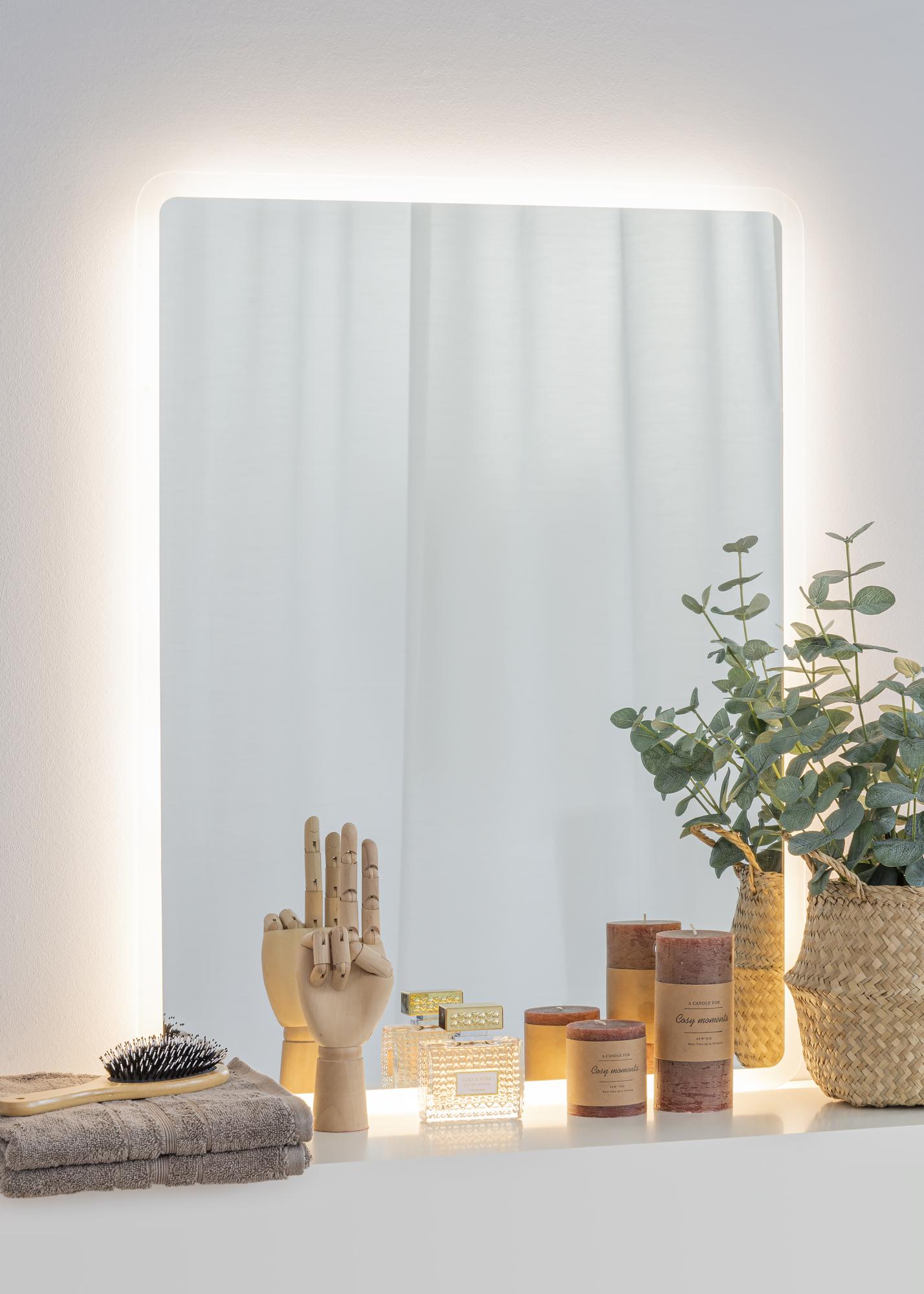 Dette baderomsspeilet i tidløs design har en rektangulær form og myke kanter med avrundede hjørner. Langs kanten er en integrert LED-belysning som rammer speilet pent inn. LED-belysningen lyser opp bak speilet og gir et fint lys fremover i 3000K som er en varmhvit nyanse. Belysningen slås enkelt på ved å trykke på den vanntette berøringsknappen på skjermen og justeres ved å holde knappen nede i noen sekunder. Speilet husker den siste lys innstillingen neste gang du slår på belysningen. Speilet er godkjent for bad.