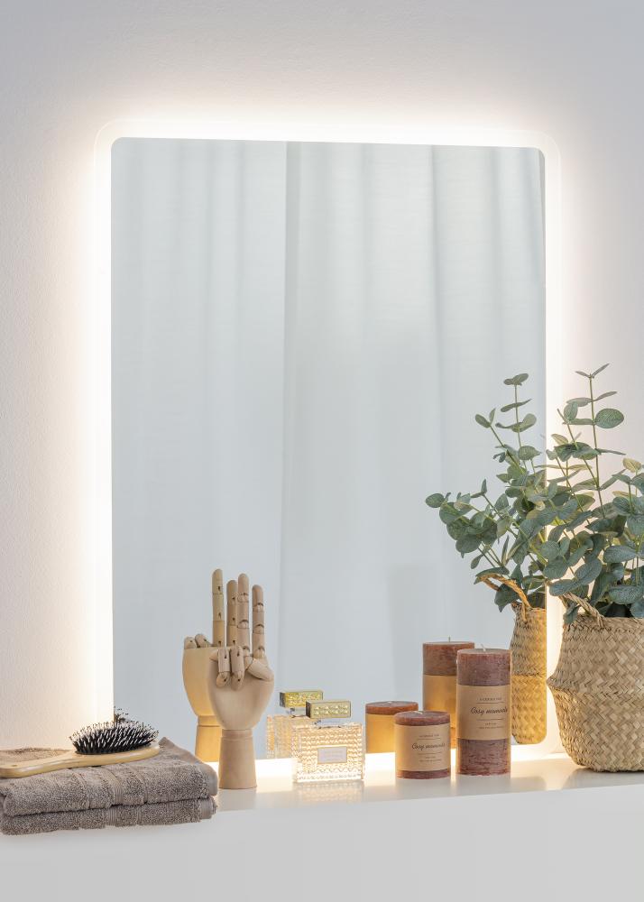 Det elegante speilet på badet er bare 3 cm dypt og måler 60x80 cm. Badespeilet har veggfester og kan monteres både vannrett og loddrett. Den dimbare LED-belysningen og de myke kantene gjør at speilet gir rommet en varm og myk følelse.