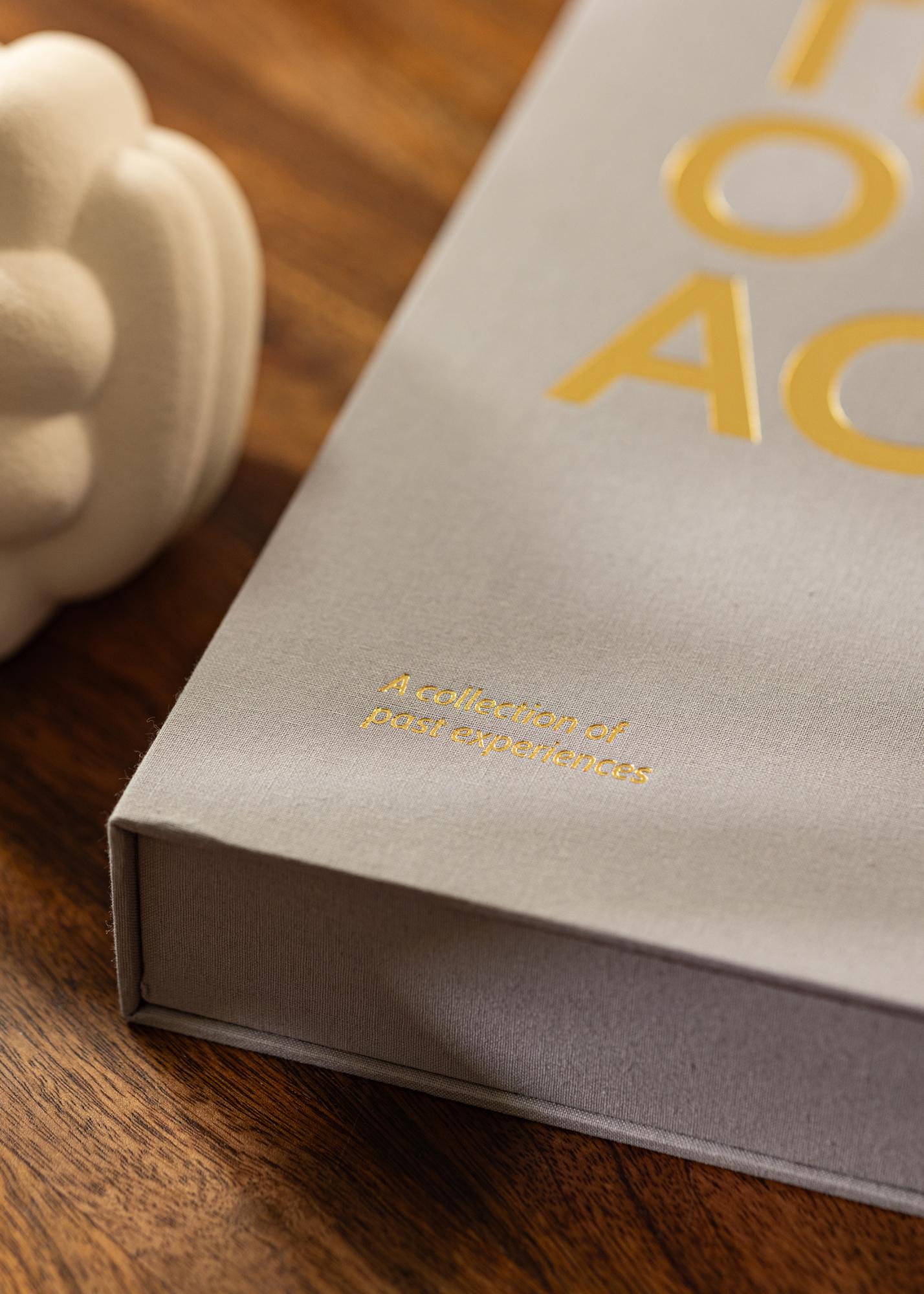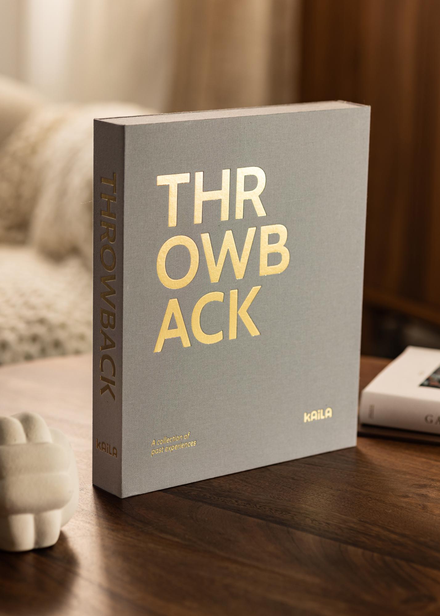 Dette er et trendy fotoalbum med lukseriøs pakning som en stilig Coffee Table Book - et såkalt salongbord fotoalbum . Fotoalbumet er designet som en eksklusiv boks som du åpner for å få tilgang til innholdet. Coveret er elegant kledd i grå tekstil og et gullfarget trykk med teksten "THROWBACK" som pryder både fronten og albumet bak. Dette kjente konseptet med å se tilbake gir fotoalbumet en moderne og litt arrogant følelse, siden det virkelig skiller seg fra de klassiske albumstiler. Albumet har også en undertekst som lyder "A collection of past experiences" som er trykt i nederste venstre hjørne.