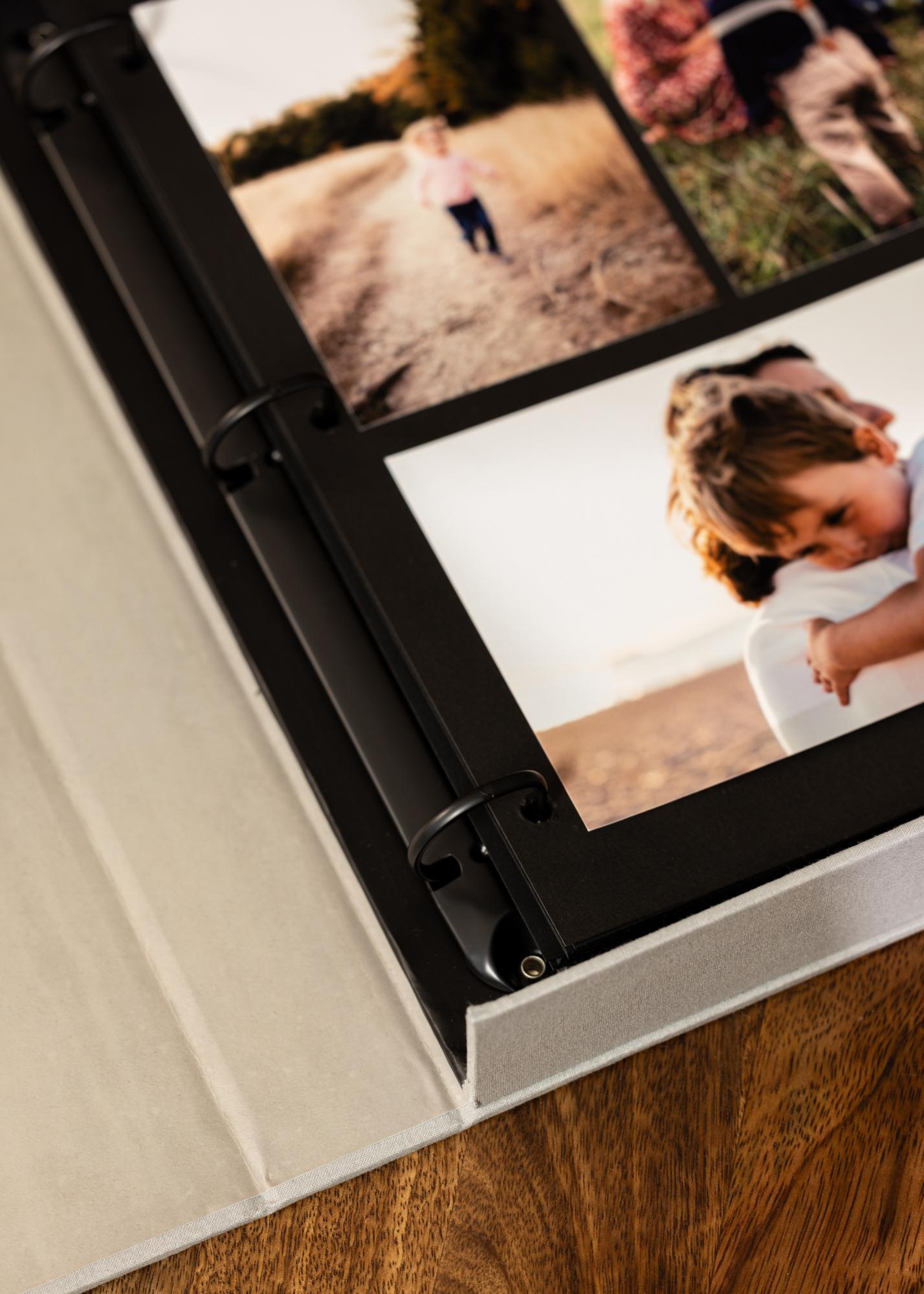 På innsiden av fotoalbumet er det en ringperm med 30 sorte ark (60 sider) som er klare til å fylles ut med dine egne tilbakeblikk. Du limer inn bildene dine selv, noe som gir plass til både fleksibilitet og kreativitet.