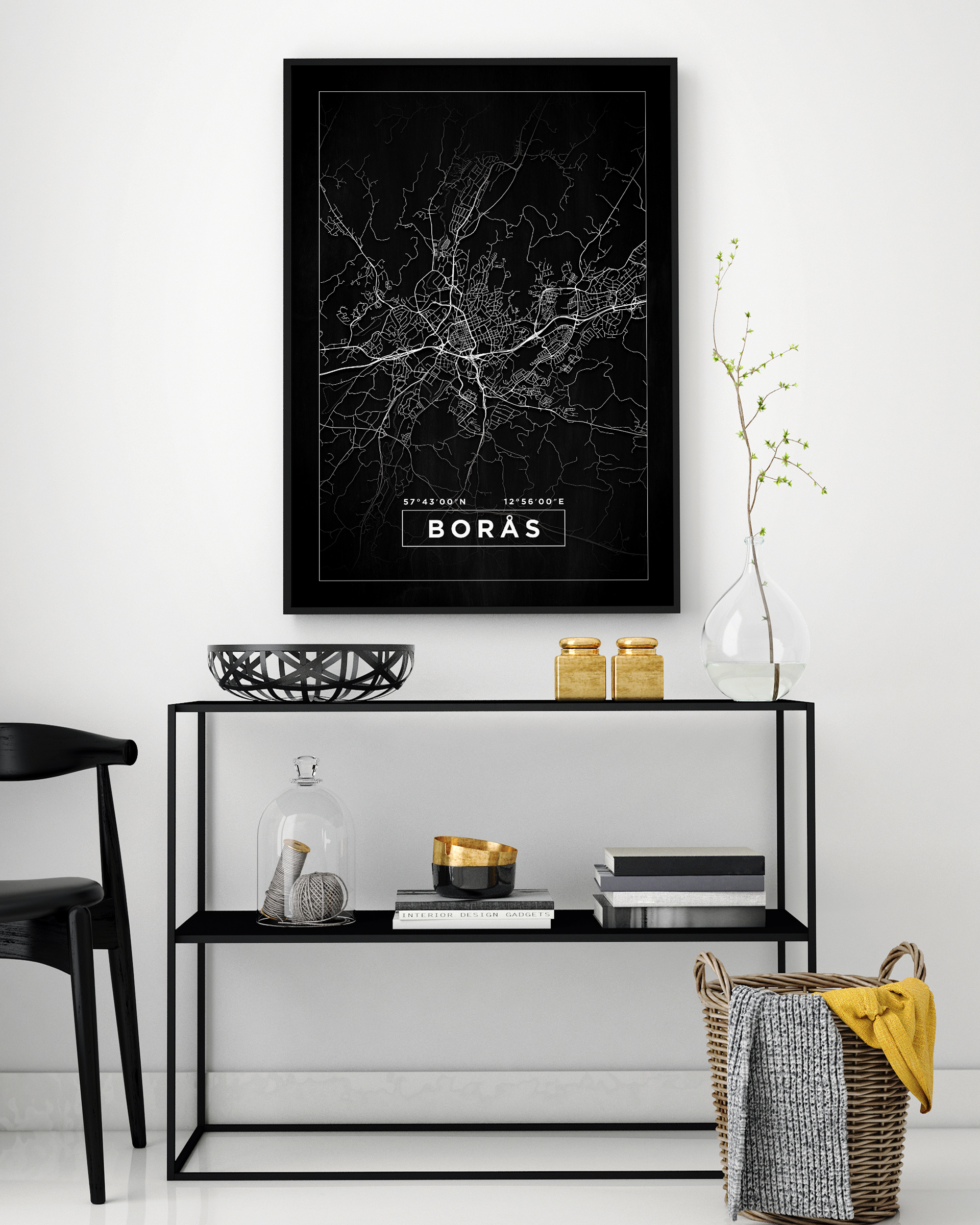 Skap en spennende atmosfære i hjemmet når du pynter veggene med kart! Her har vi et lekkert kart over den koselige byen Borås. Plakaten har et kontrastfullt design med svart bakgrunn og byens veier og område i kritthvitt. Nedenfor finner du byens navn sammen med koordinatene og rundt motivet løper en hvit linje. Det svarte og hvite i plakaten blir veldig fint sammen med en ramme i hvitt, gull eller sølv. Ettersom den finnes i flere ulike størrelser finner du enkelt en som passer bra i akkurat ditt hjem.