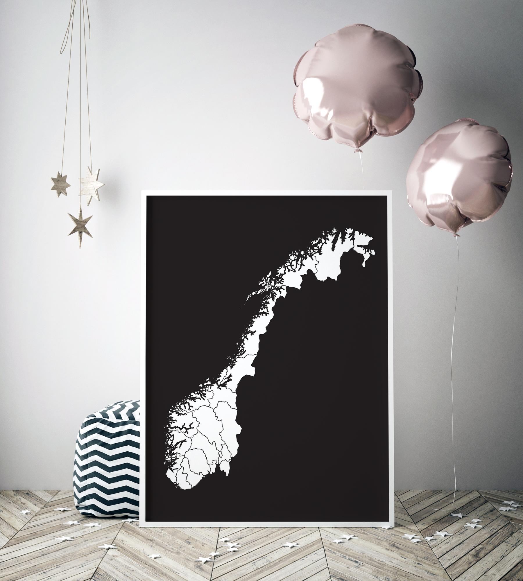 La dine varme følelser for Norge speiles i ditt interiør! Her har vi en fint grafisk kart over landet som garanter gjør veggen fin! Kartet finnes i fargene blå, grå, grønn, rosa, svart med hvit bakgrunn og hvit med svart bakgrunn samt regnbuefarget. Velg mellom 8 ulike størrelser og kompletter gjerne med en matchende ramme!