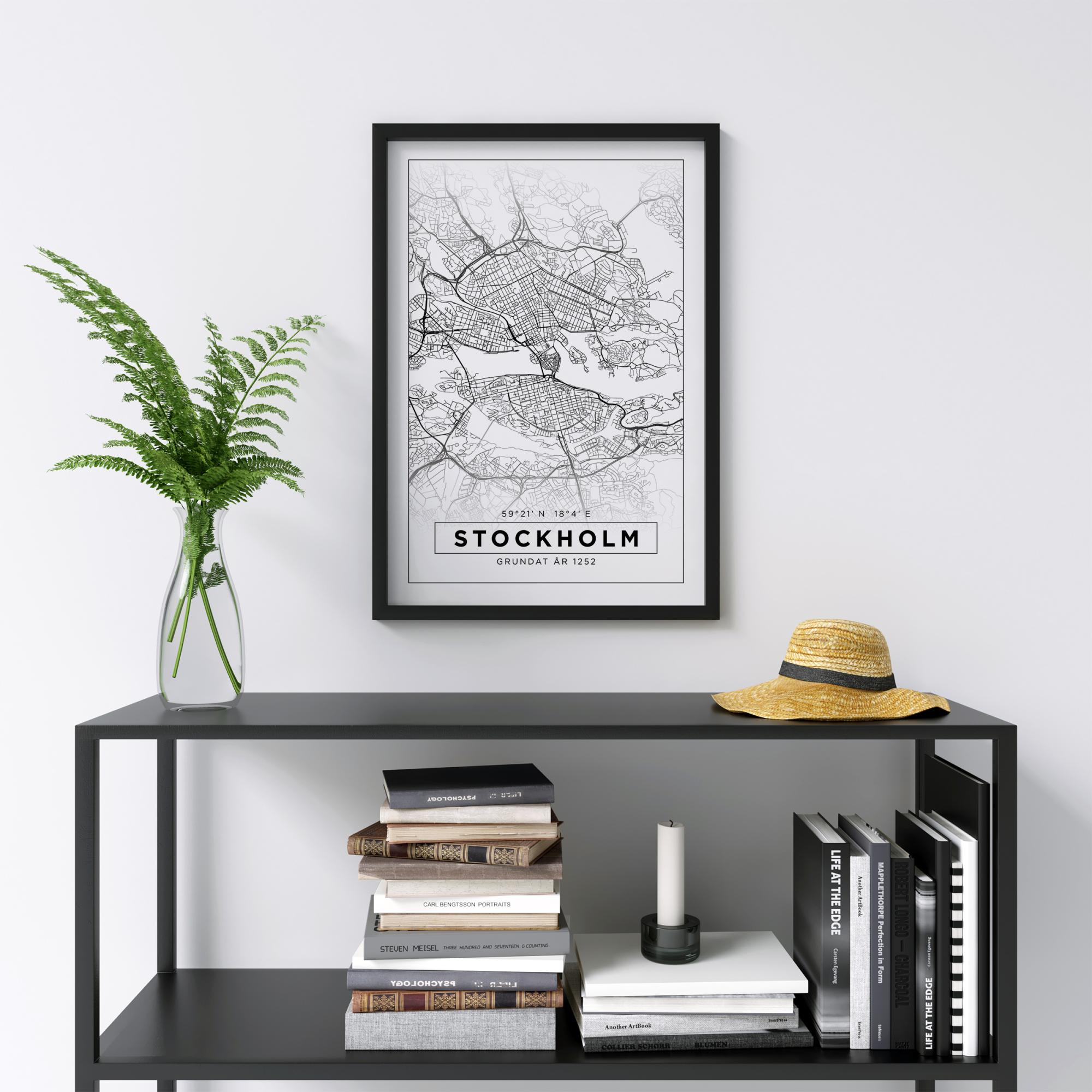 Gi Stockholm hedersplassen på veggen når du dekorerer med denne stilfulle poster! Motivet viser et svart kart over byen mot en hvit bakgrunn. Nederst står teksten "Stockholm, grundat år 1252" sammen med koordinatene. Rundt byens navn samt rundt motivet går det svarte tynne linjer. Velg mellom hele 7 ulike format! Kompletter gjerne med en stilig ramme fra vårt store sortiment.