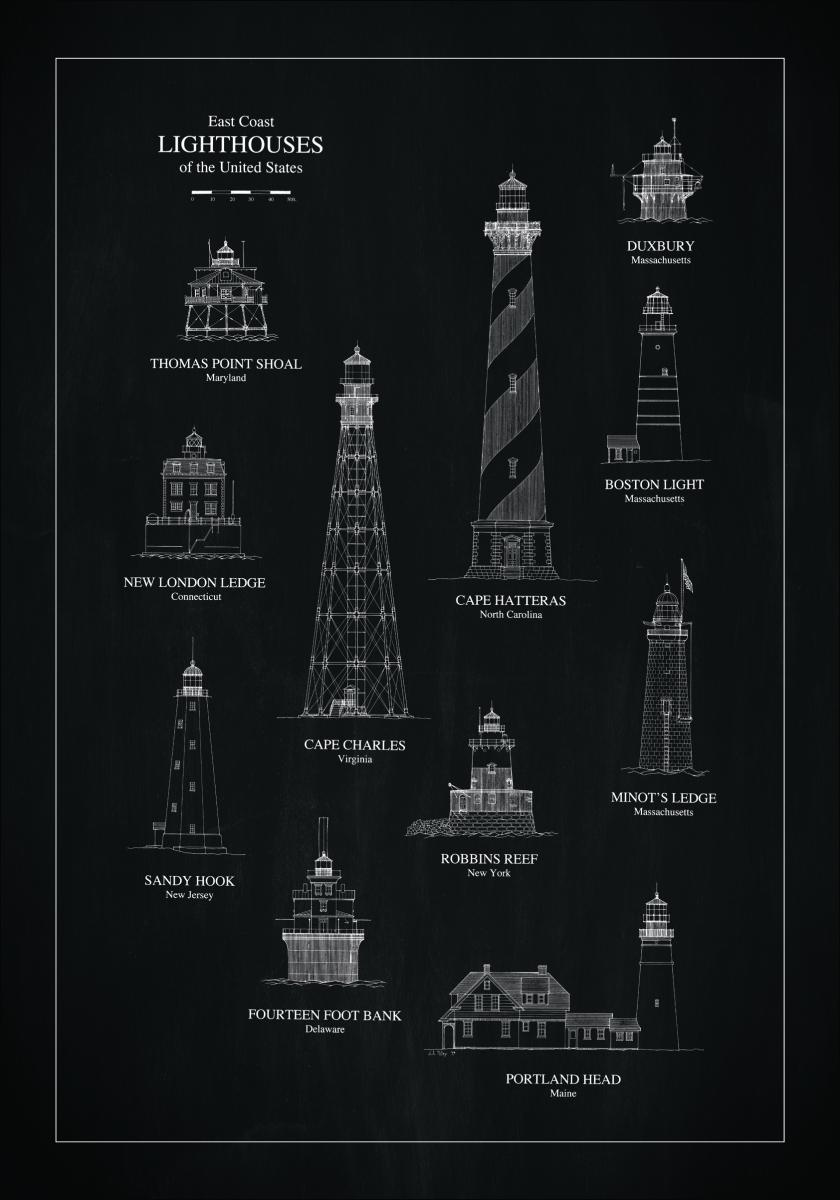 La dine vegger følge et maritimt vintage-tema og dekorer dem med våre plakater som har motiv av fyrtårn og fartøy! Denne originale plakaten minner om en svart krittavle med et lekkert motiv som ser ut til å være tegnet med et tynt hvitt kritt. Motivet viser 11 vakre fyrtårn som ligger langs USAs østkyst. En drøm for deg som liker arkitektur og tegninger! Ettersom plakaten finnes i en rekke ulike størrelser finner du enkelt en som passer i akkurat ditt hjem. Kompletter gjerne med en hvit eller gullfarget ramme.
