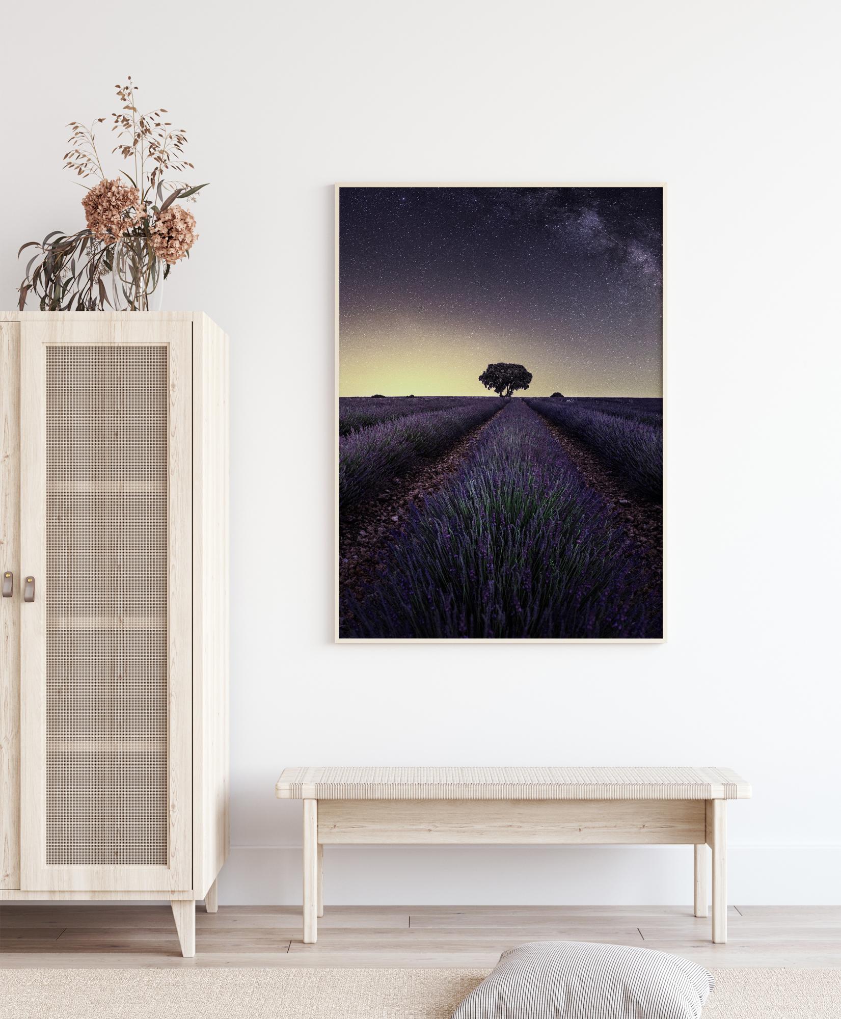 En helt fortryllende plakat med en eng av lavendel. De intense nyansene av lilla lavendel danser i morgenbrisen. Komplimentert med den mørke stjernehimmelen, opplyses et enslig tre av en tidlig morgensol. Heng denne plakaten på kjøkkenet ditt for en naturlig stemning.