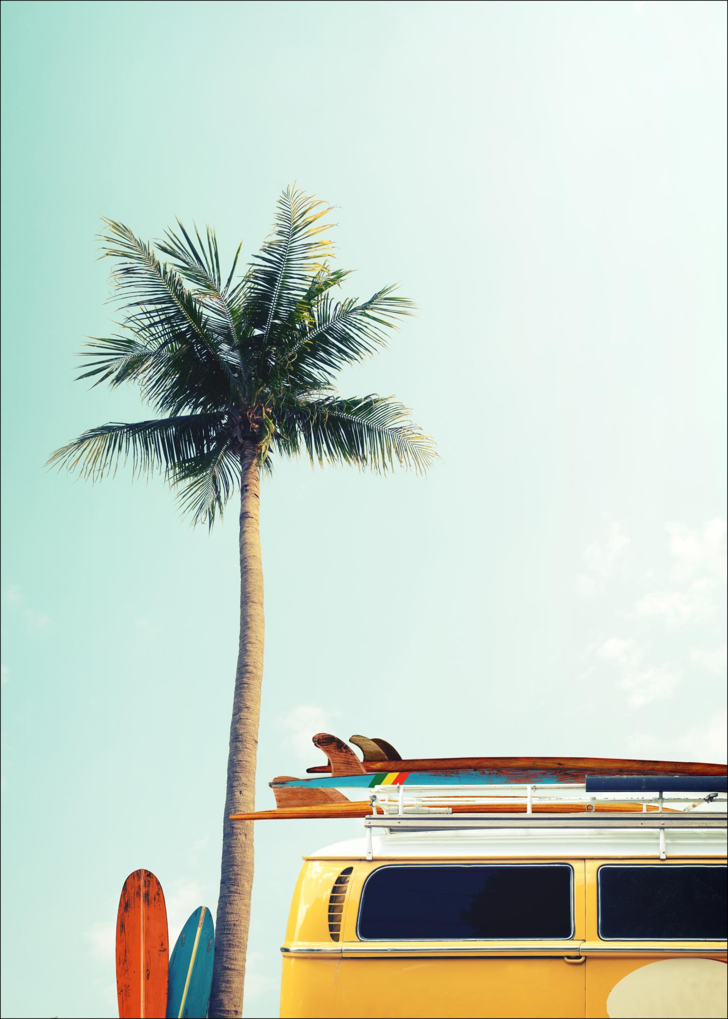En fotografisk poster med den klassiske folkevognbussen med sine surfebrett, parkert ved en palme under en skyfri himmel. En fargerik poster som gir en herlig følelse av sommer og frihet. Kombiner gjerne med andre favoritter på en større bildevegg.