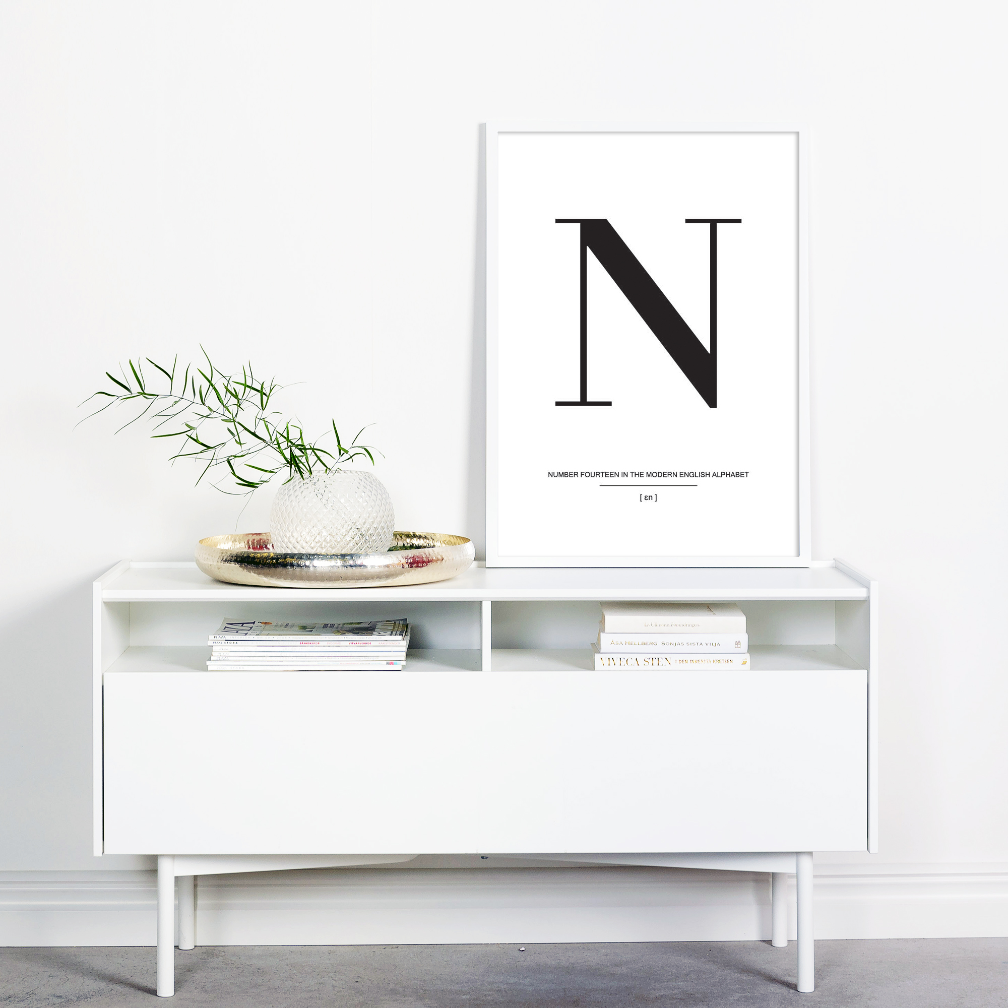 I enkelheten finnes det vakre, og det beviser virkelig denne stilrene plakaten med bokstaven N i svart mot en hvit bakgrunn. Plakaten har en stilig typografi og bør kompletteres med andre bokstavsposters fra samme serie for å skape en trendy og vakker bildevegg. Velg dine favorittposters med bokstaver på og velg blant vårt store utvalg av kvalitetsrammer, så er det bare å la fantasien flyte hjemme på veggene.