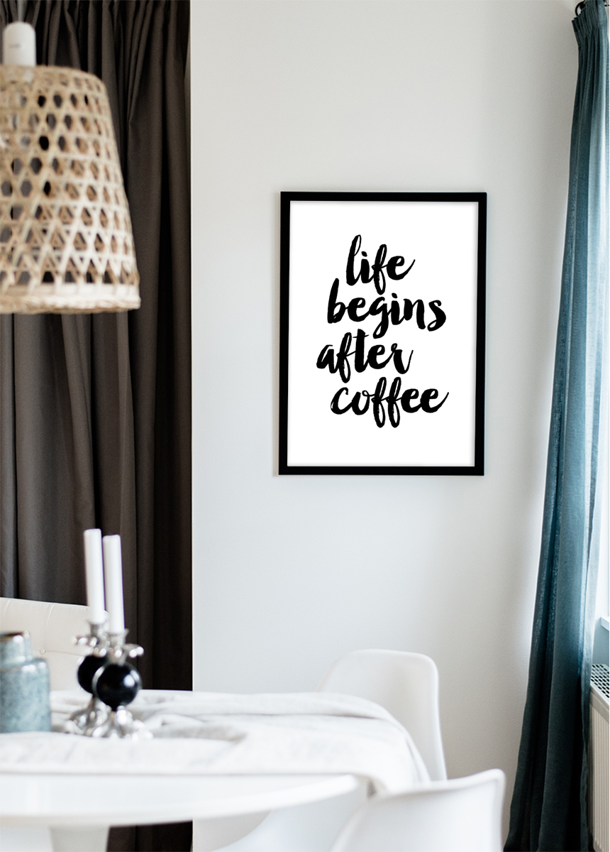 Du vet at du vil gjøre det bra på jobb i dag, og at etterpå vil du til og med ha energi til sosialt samvær med familie og venner. Men faktum er at før du kan gjøre noe av det så må du ha en kopp oppfriskende kaffe. Det er ingenting å skjemmes over! Sett istedet opp denne herlige plakaten på veggen og nyt en kopp av den vidunderlige drikken. Plakaten er hvit med et svart trykk i form av teksten ”Life begins after coffee” skrevet med en leken skrift. Kompletter med en ramme og et passepartout etter din smak. Finnes i flere ulike størrelser og prisklasser.
