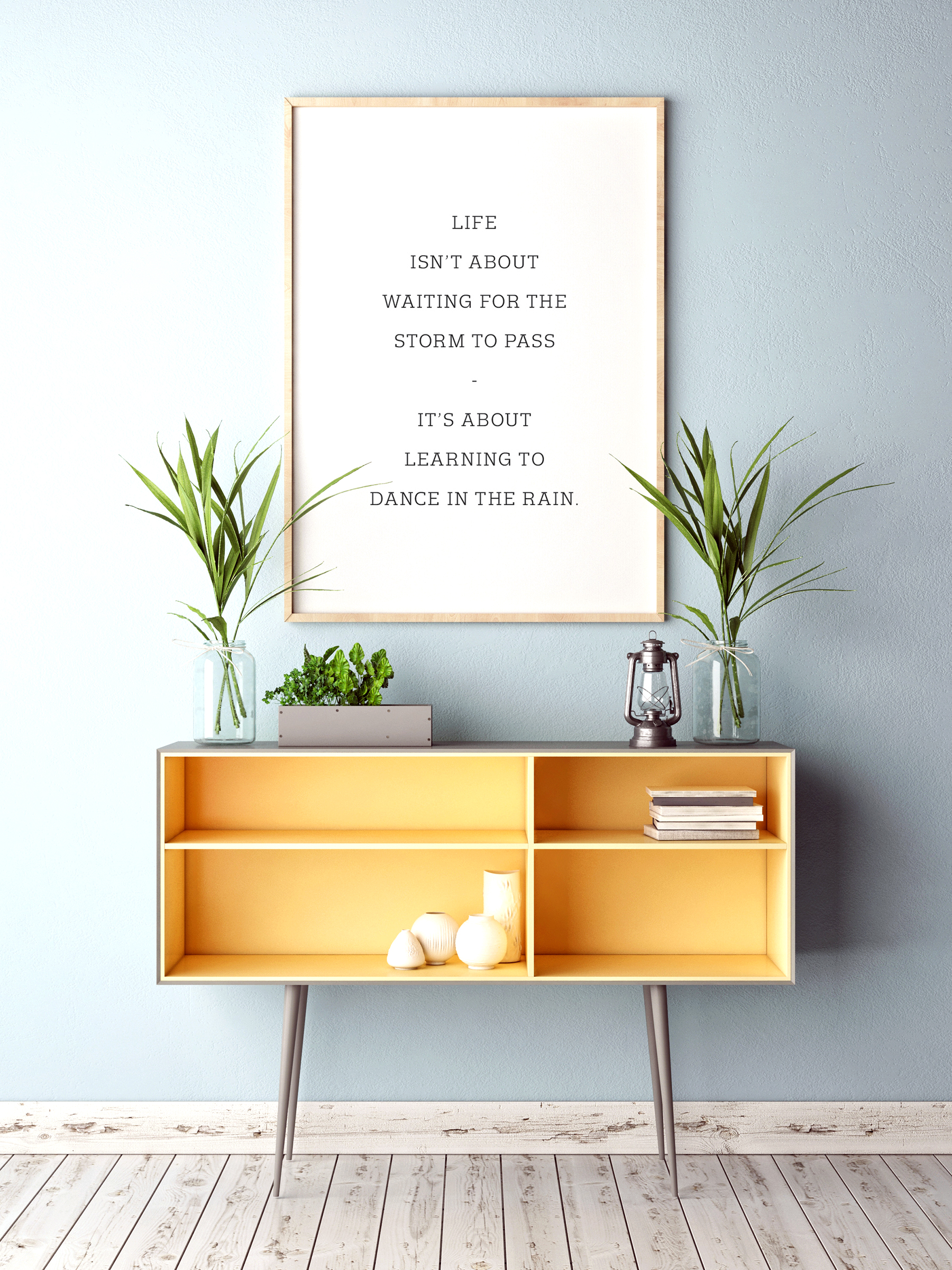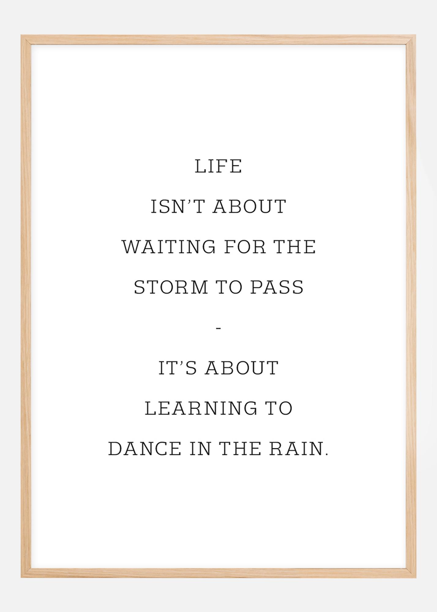 En meningsfylt svart og hvit motivasjonsplakat som fremhever viktigheten av å stå opp mot problemer. Skrevet i enkle dristige svarte store bokstaver, er meldingen helt tydelig. «Livet handler ikke om å vente på stormen å passere - det handler om å lære å danse i regnet». Et enkelt, men moderne bilde å henge på en hvit vegg.