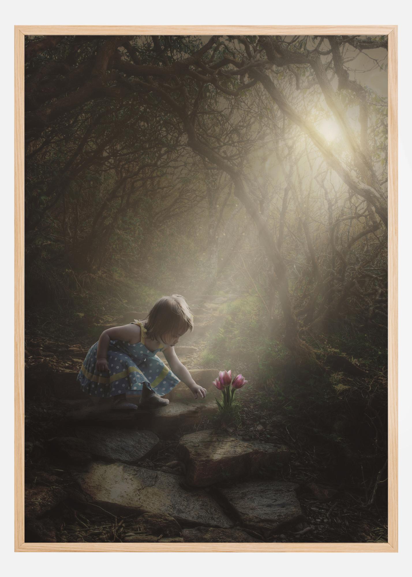 Vakker grafisk kunst som tar deg med til en eventyrlig verden med sitt magiske lys, trolske skog og den lille jenta på utforskende eventyr. En drømmeaktig poster som bare blir bedre og bedre jo større den blir.