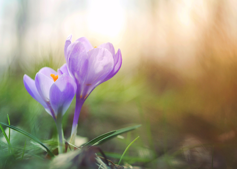Et sjarmerende bilde av vårens kanskje mest fargerike soldyrkere: Krokusen. Den uklare forgrunnen i komplementærfarger fremhever blomstene og skaper harmoni i fotografiet. Passer for de som ønsker glade farger i hjemmet, og det er alltid fint å bruke en nyanse fra bildet som en aksentfarge i resten av innredningen. Kan kombineres med andre plantemotiver for å skape en helhetsfølelse i rommet.