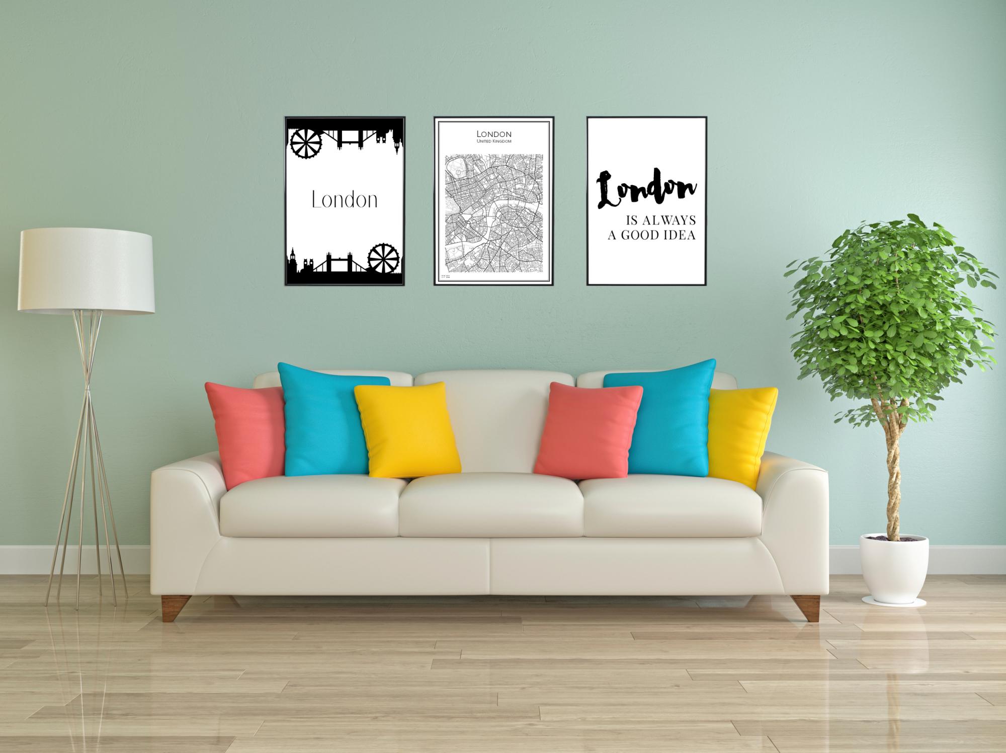 Plakaten for den som er besatt av London og gjerne stikker av på en helgetur så snart anledningen byr seg. Det grafiske trykket er pent å henge sammen med andre Londonmotiver, som kart og fotografier, på en temavegg som blir et blikkfang i rommet. Posteren gjør seg godt i en svart eller hvit tynn ramme som lar motivet tale og den stilrene tavlen passer fint inn i alle typer av innredningsstiler og miljøer.