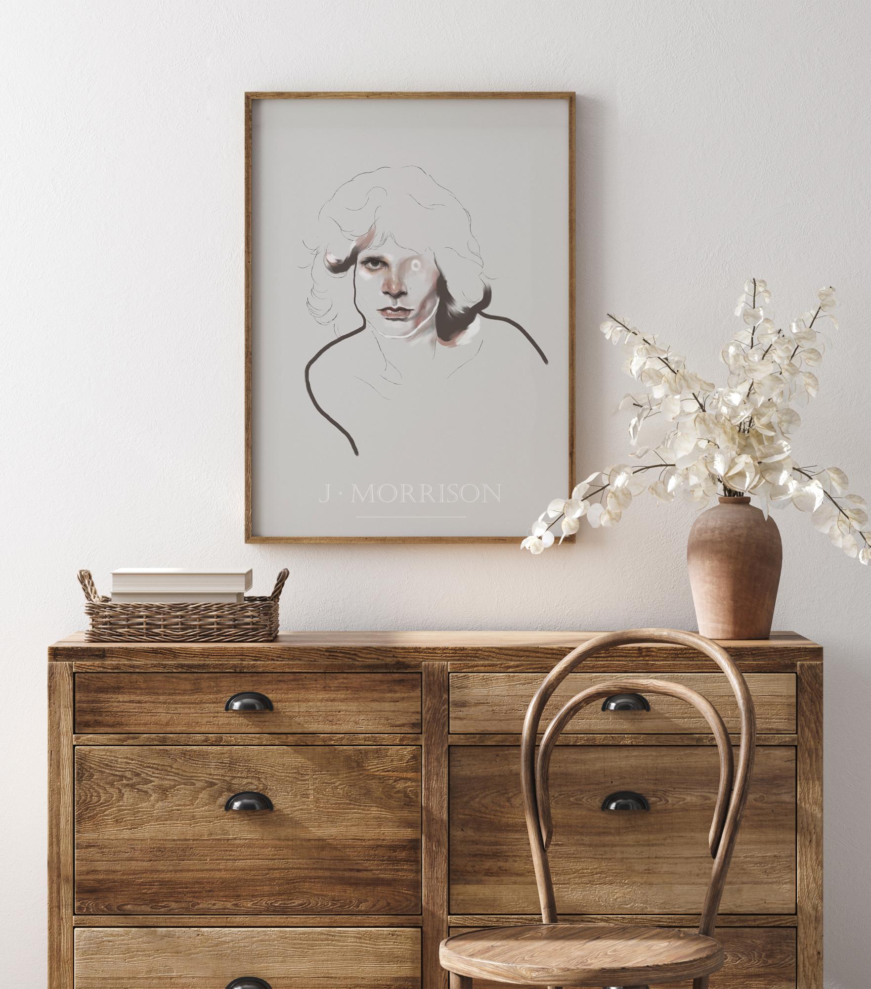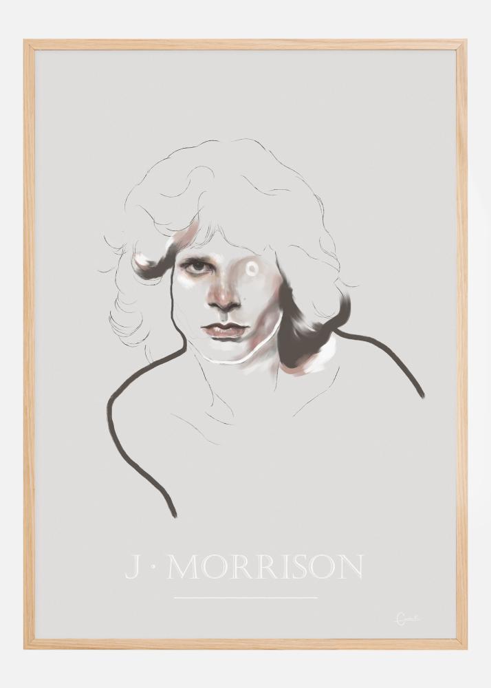 En vakker plakat av J. Morrison. Kunstnerens hode og skuldre er tegnet med svart penn på en beige bakgrunn, mens munnen er skissert i brunt. Venstre øye er uten øyelokk. En ideell plakat for alle som elsker musikk.