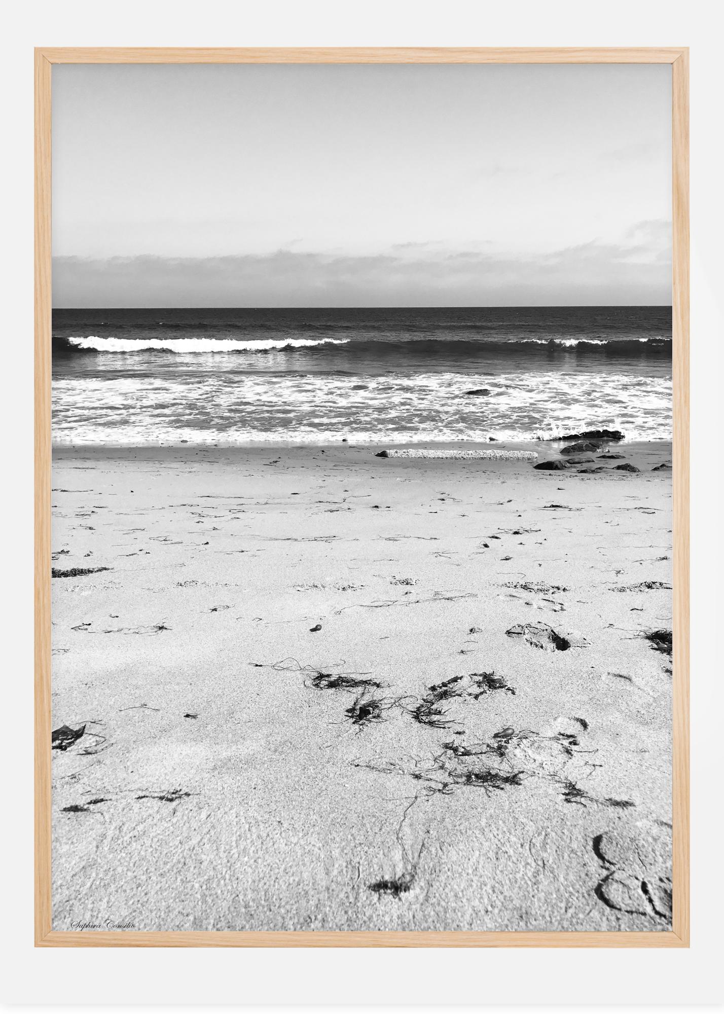 Et naturfotografi i svart-hvitt der skummende bølger skyller inn over en stille strand. Noen lette fotspor i sanden er det eneste som røper menneskelig nærvær. En rolig og harmonisk poster skapt av fotograf Saphira Consilio.