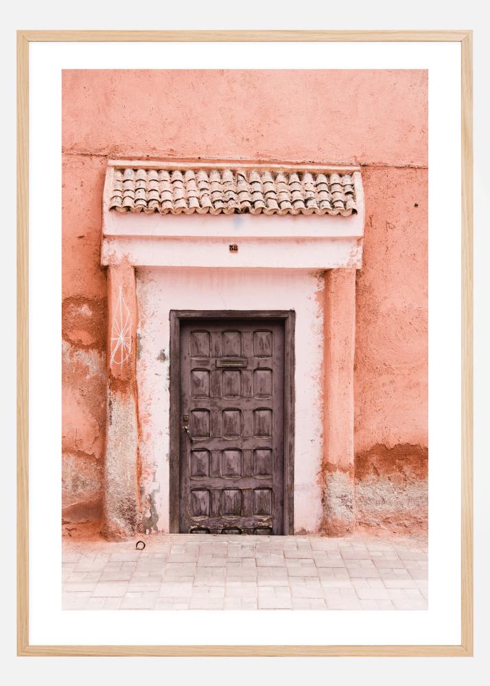 En vakker fersken- og brunfarget plakat med en brun inngangsdør i tre. Det marokkanske huset er malt i en vakker ferskenfarget tone, og den hvite veggen som omgir døren tilfører ekstra lys til portrettet. Heng denne vakre ferskenfargede plakaten på en beige vegg for å skape en følelse av harmoni.