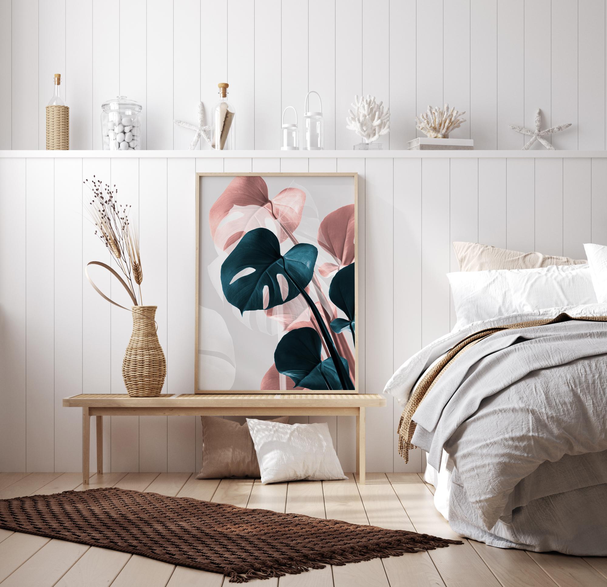 En vakker plakat med rosa og mørkegrønne monstera-blader som viser feilfri kreativitet i bladene sine. De hjerteformede bladene gløder med sine vakre grønne og rosa blader mot en beige bakgrunn. Pinnation-strukturene bringer en spennende følelse til ditt hjem.