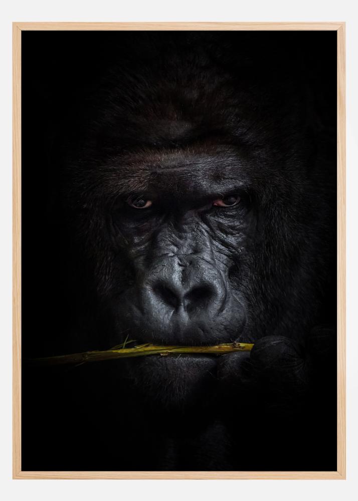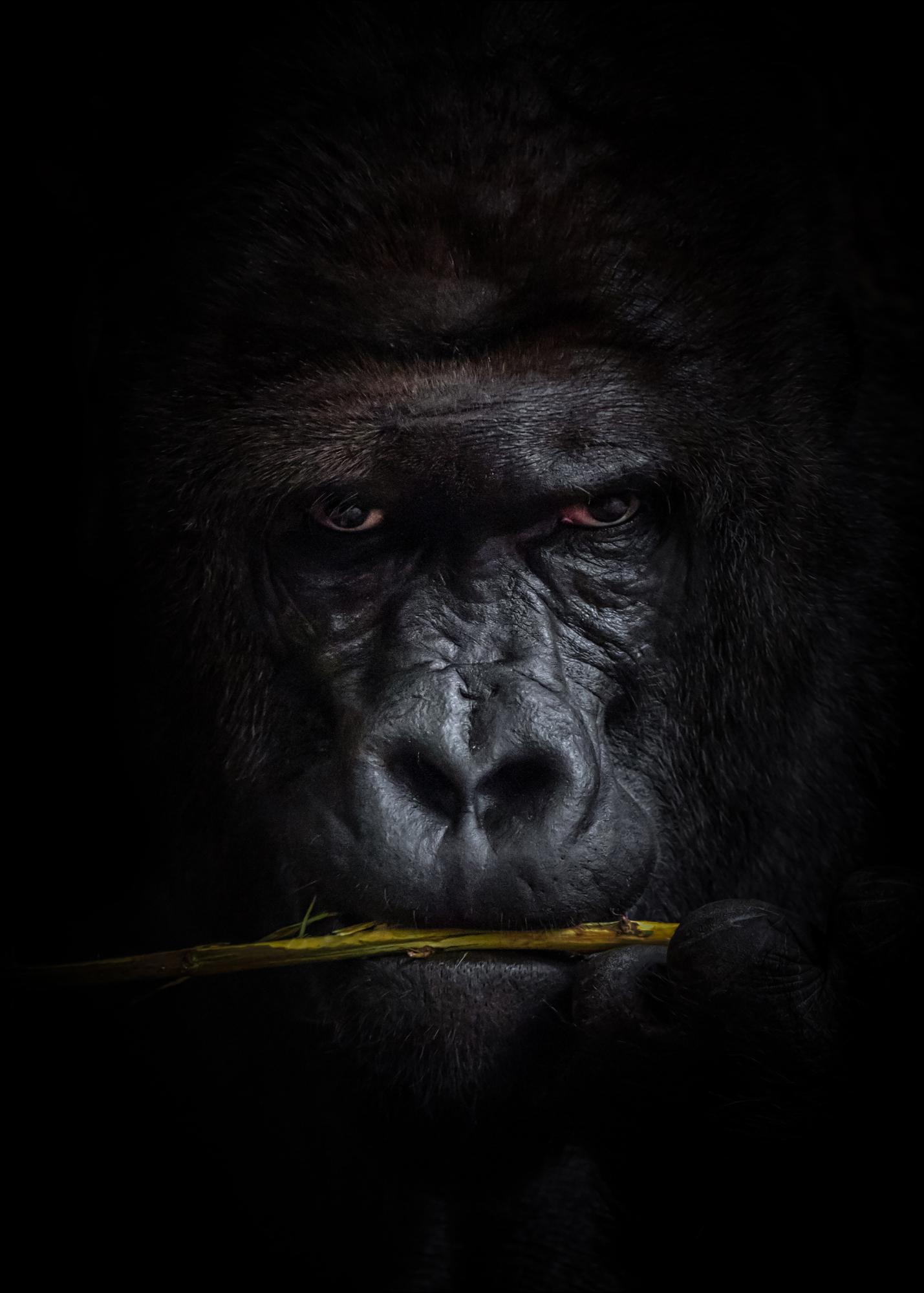 Et nærbildeportrett av en gorilla som gnager på barken av en gren. Blikket er rettet mot fotografen, og den mørke pelsen blander seg inn i den svarte bakgrunnen og skaper en herlig dybde til motivet. En mektig poster med et intimt møte med en av regnskogens største primater.