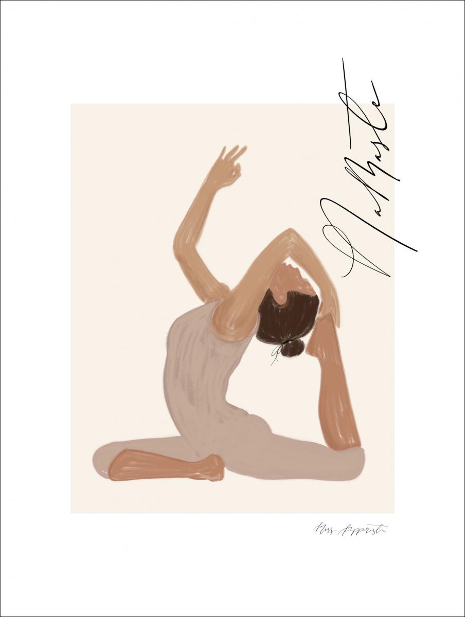 En grafisk poster i myke pasteller, som fremstiller en kvinne i en yogaposisjon sammen med budskapet "Namaste" (Jeg bukker for deg) i vakker kalligrafi. Et harmonisk og fredfullt motiv som er innrammet og fremhevet med en bredere passepartout i hvitt, skapt av Jenny Skantz, Miss Papperista.